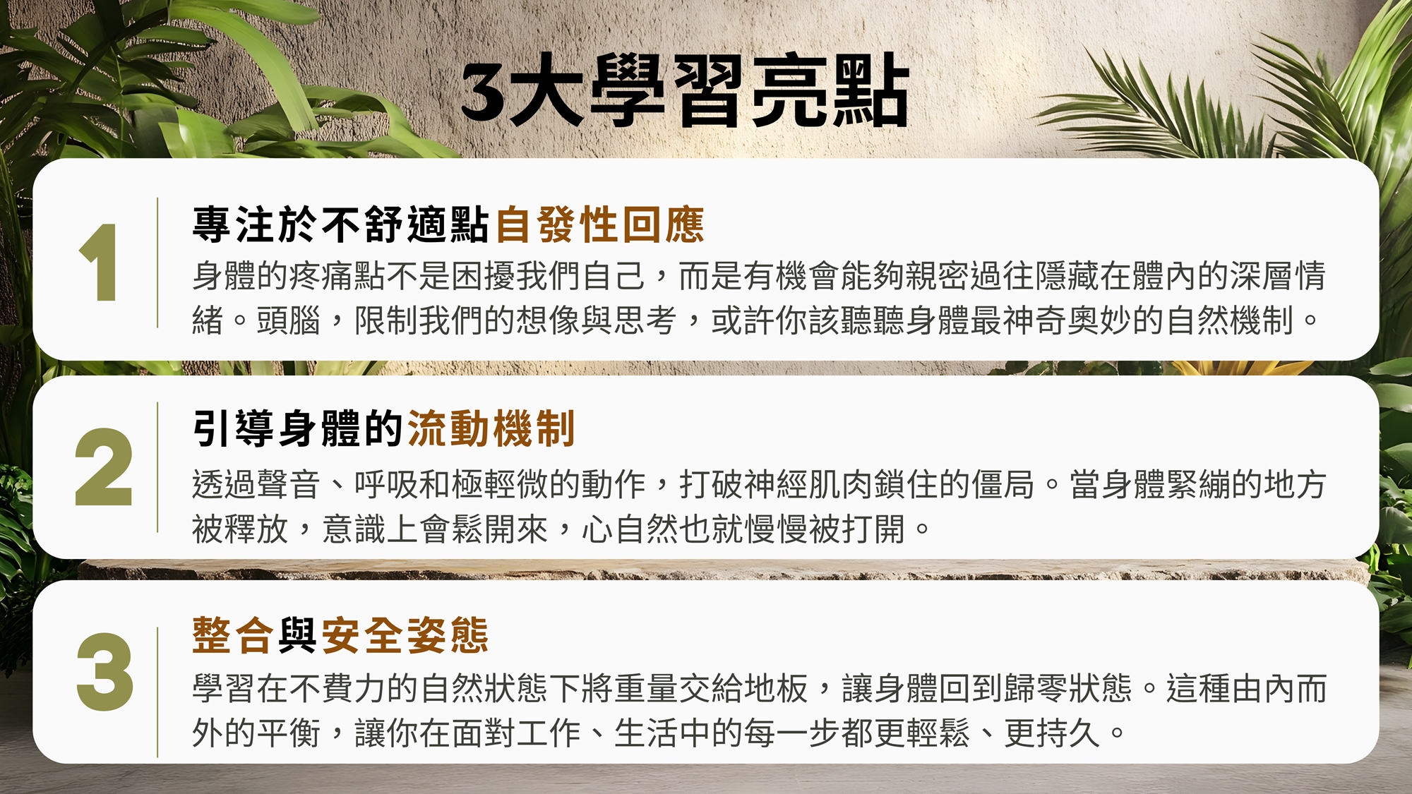 透過聲音、呼吸和極輕微的動作,打破神經肌肉鎖住的僵局。當身體緊繃的地方被釋放,意識上會鬆開來,心自然也就慢慢被打開。