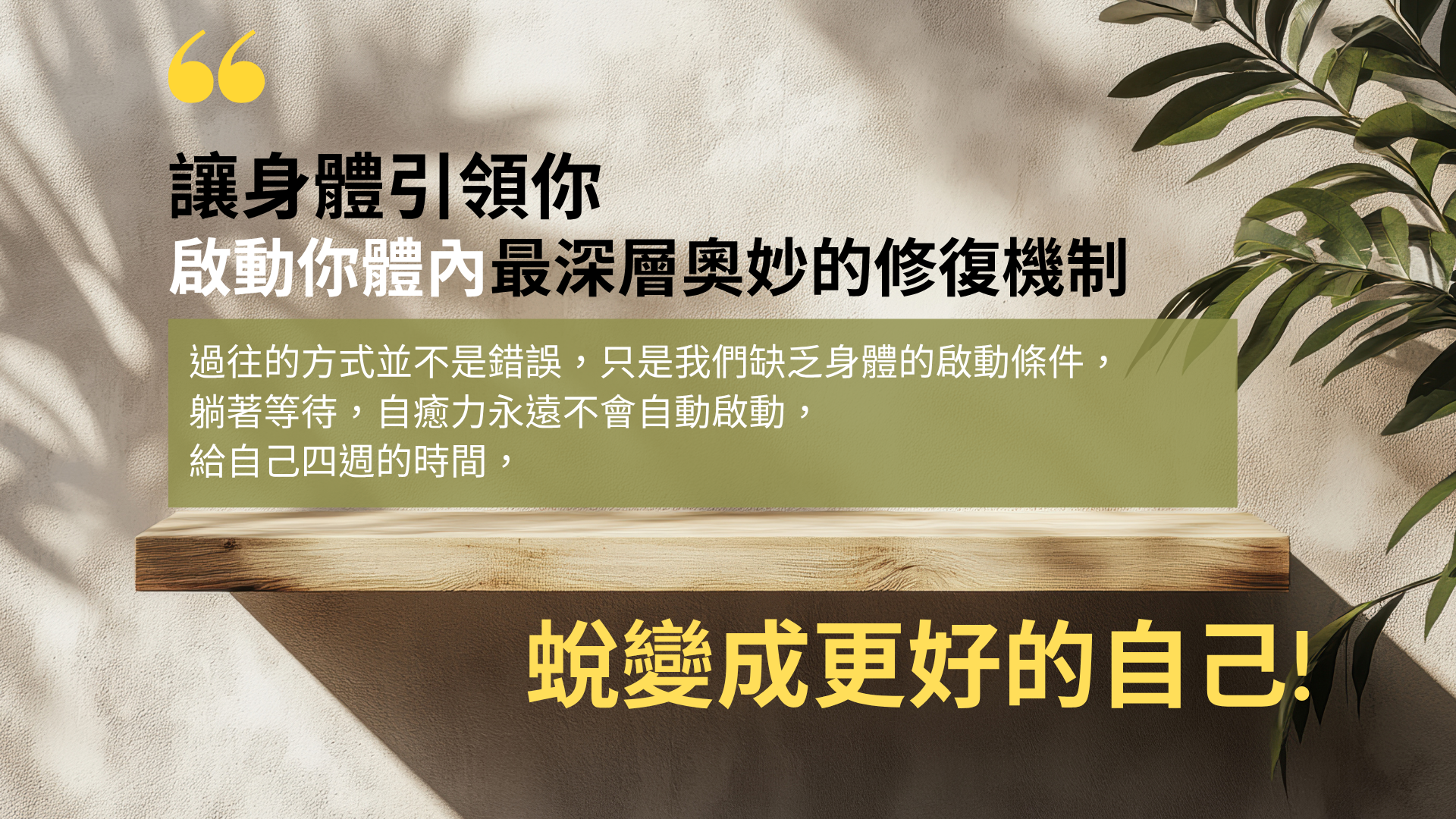 給自己四週的時間,讓身體引領你,啟動你體內最深層奧妙的修復機制。