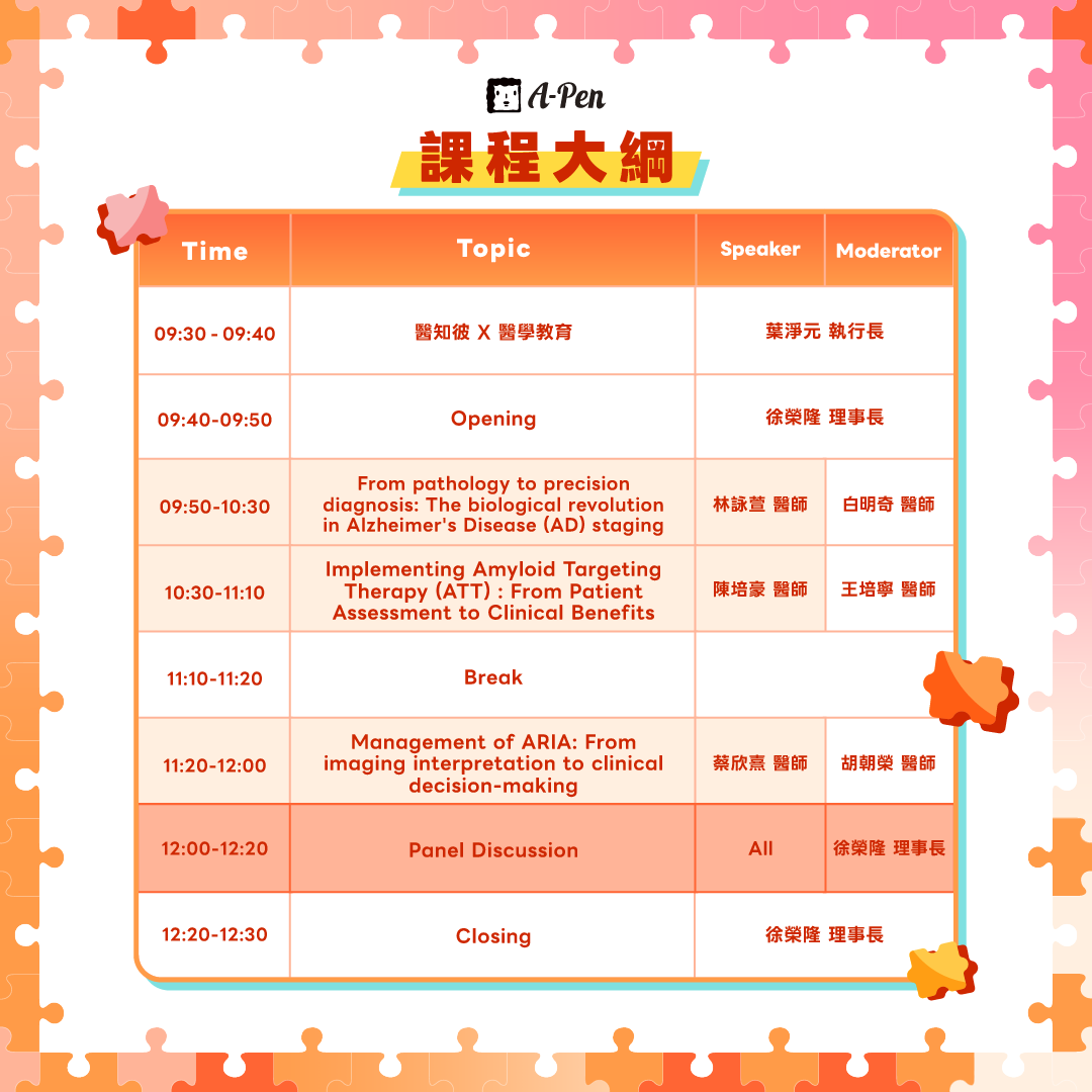 👨⚕️ A-Pen 此次特別邀請到具備豐富失智症預防與照護經驗的專家們,與您一同深入剖析最新的臨床試驗經驗與文獻,幫助您全面掌握阿茲海默症的最新診斷、治療進展及臨床應用!📊
