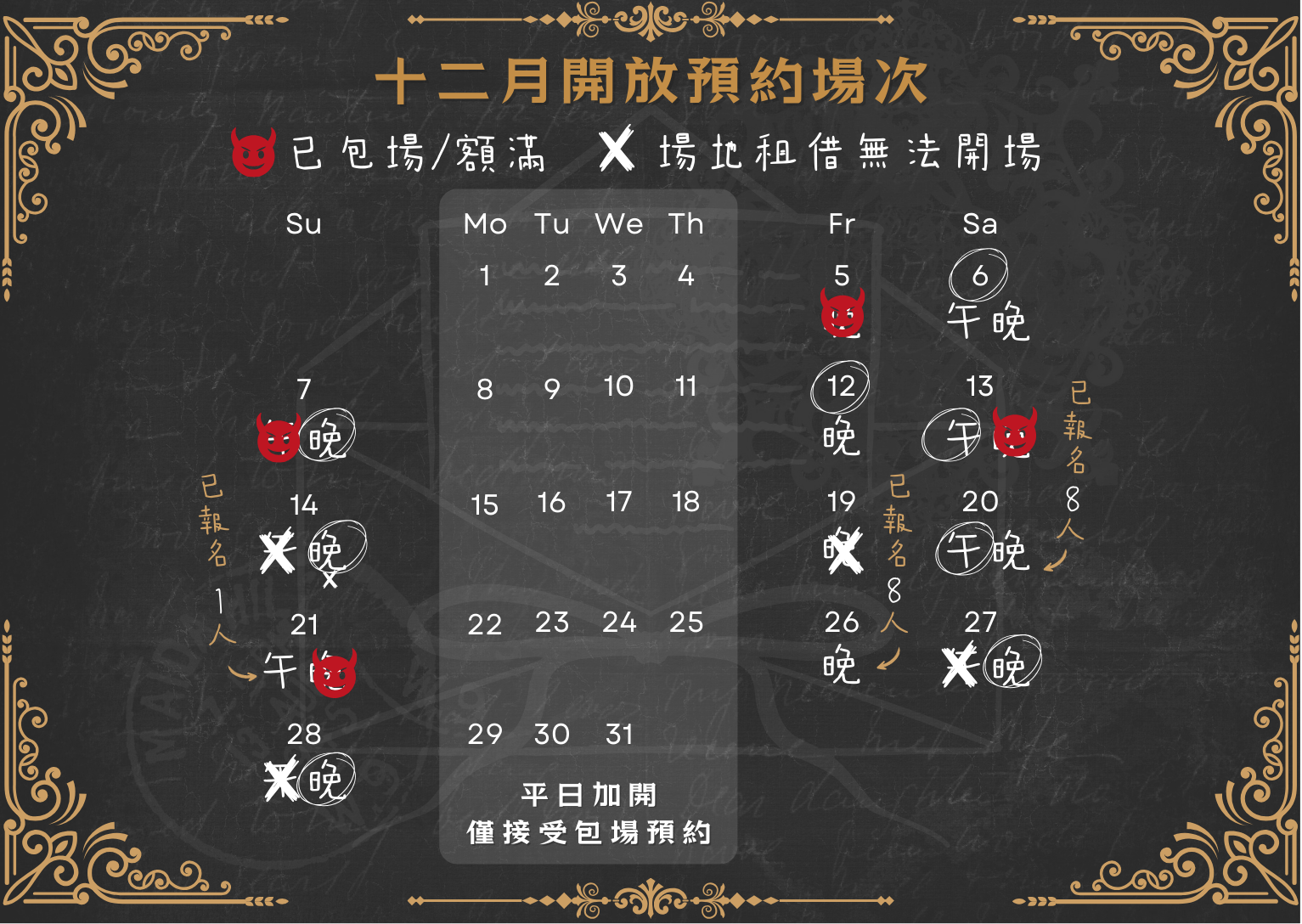 👥 挑戰者人數:10-18人,遊戲推薦人數13人以上(10人成團,如無成團會於兩天前告知,並進行後續處理)
