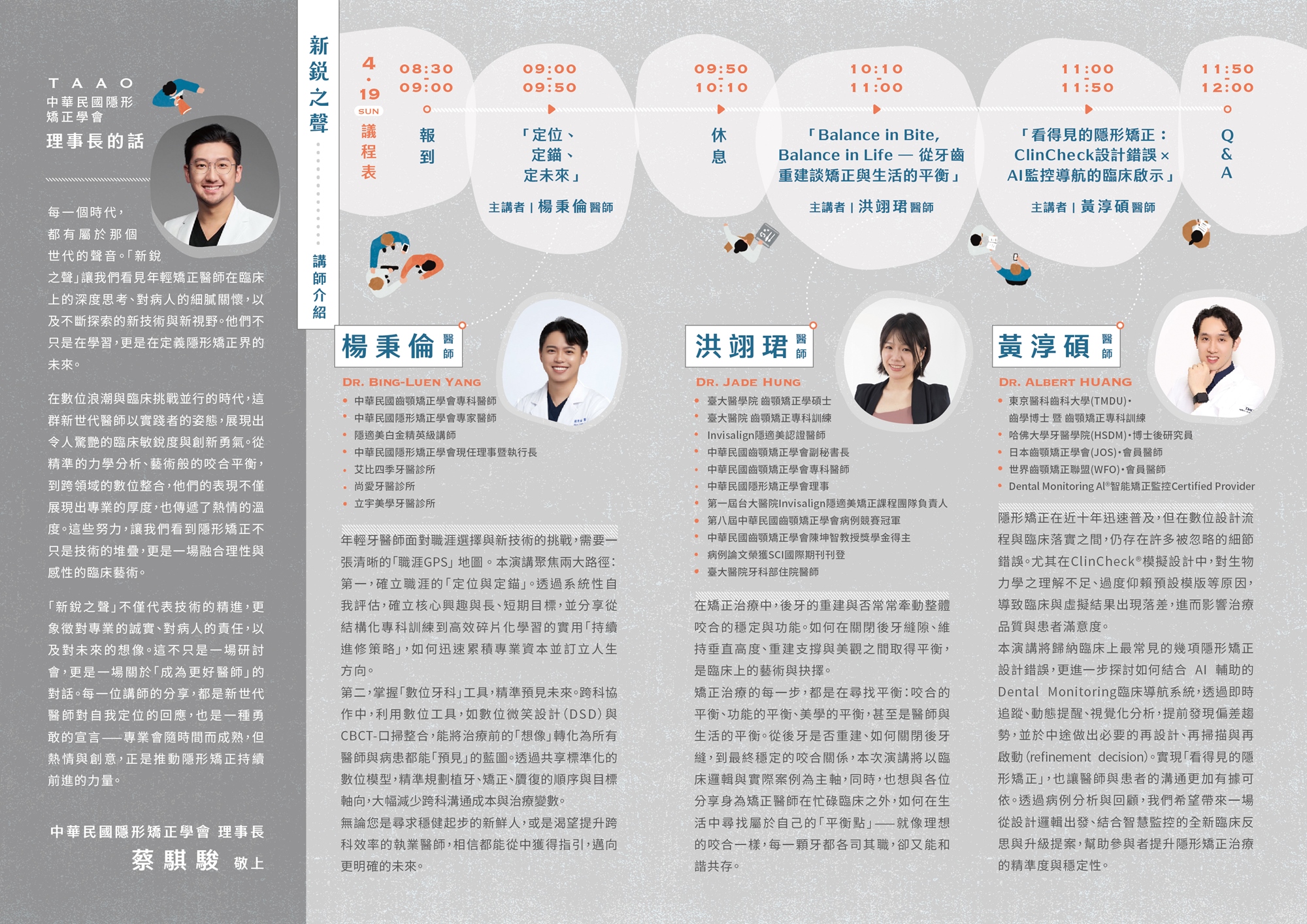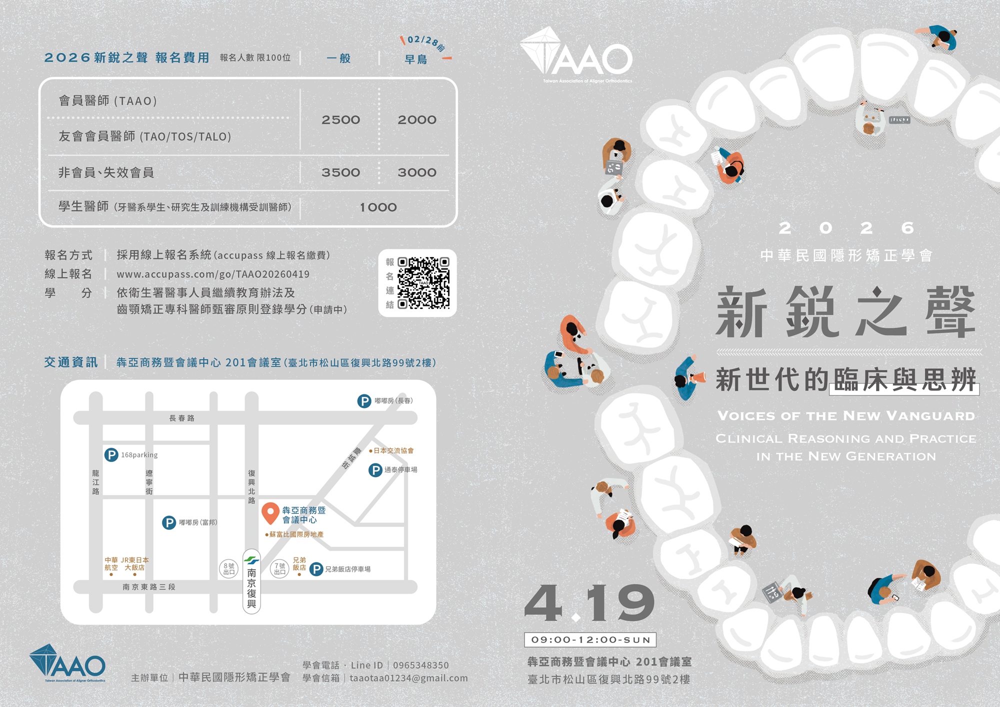 本學會為非營利單位,依規定僅提供[收據],不開立統一發票,敬請見諒,若有其他需求也歡迎與我們聯繫,謝謝您!-活動資訊日期:2026.04.19(日) 9:00-12:00地點:犇亞商務暨會議中心 201會議室(臺北市松山區復興北路99號2樓)主辦單位:中華民國隱形矯正學會