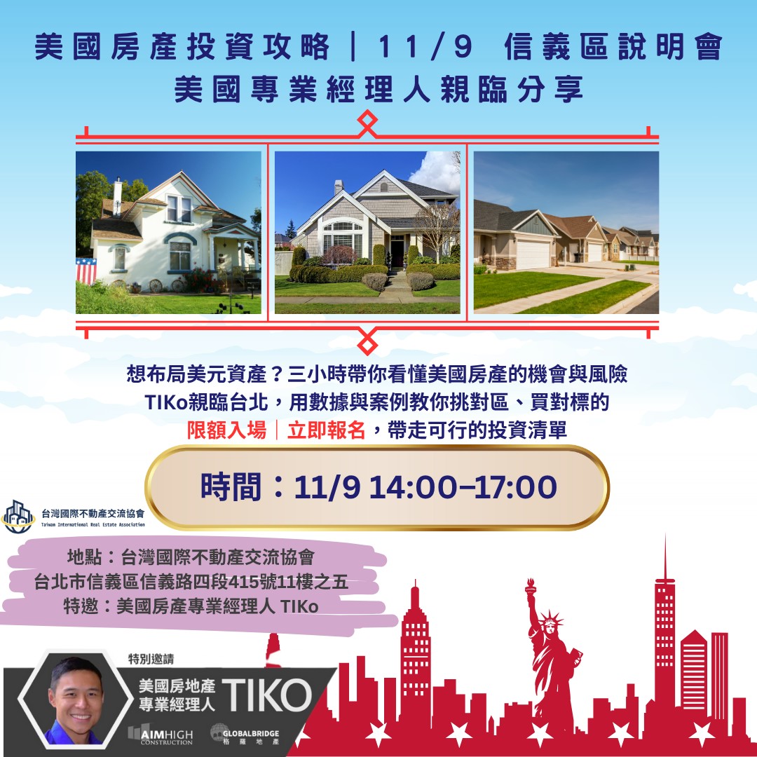 想布局美元資產,卻卡在城市怎麼選、報酬怎麼估、稅務怎麼報?美國房產專業經理人~TIKo在台北信義區現場解析美國房市趨勢與評估框架,從區域挑選、租金與空置率、貸款與稅務到風險避雷,三小時帶你建立可執行的投資方法。