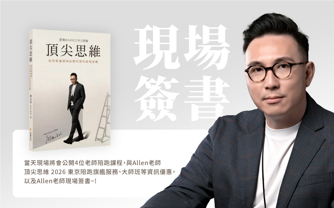 當天將會公開4位業師陪跑課程的專屬優惠,以及Allen老師頂尖思維 2026 東京陪跑旗艦服務、大師班等資訊優惠,還有加碼Allen老師現場簽書~!