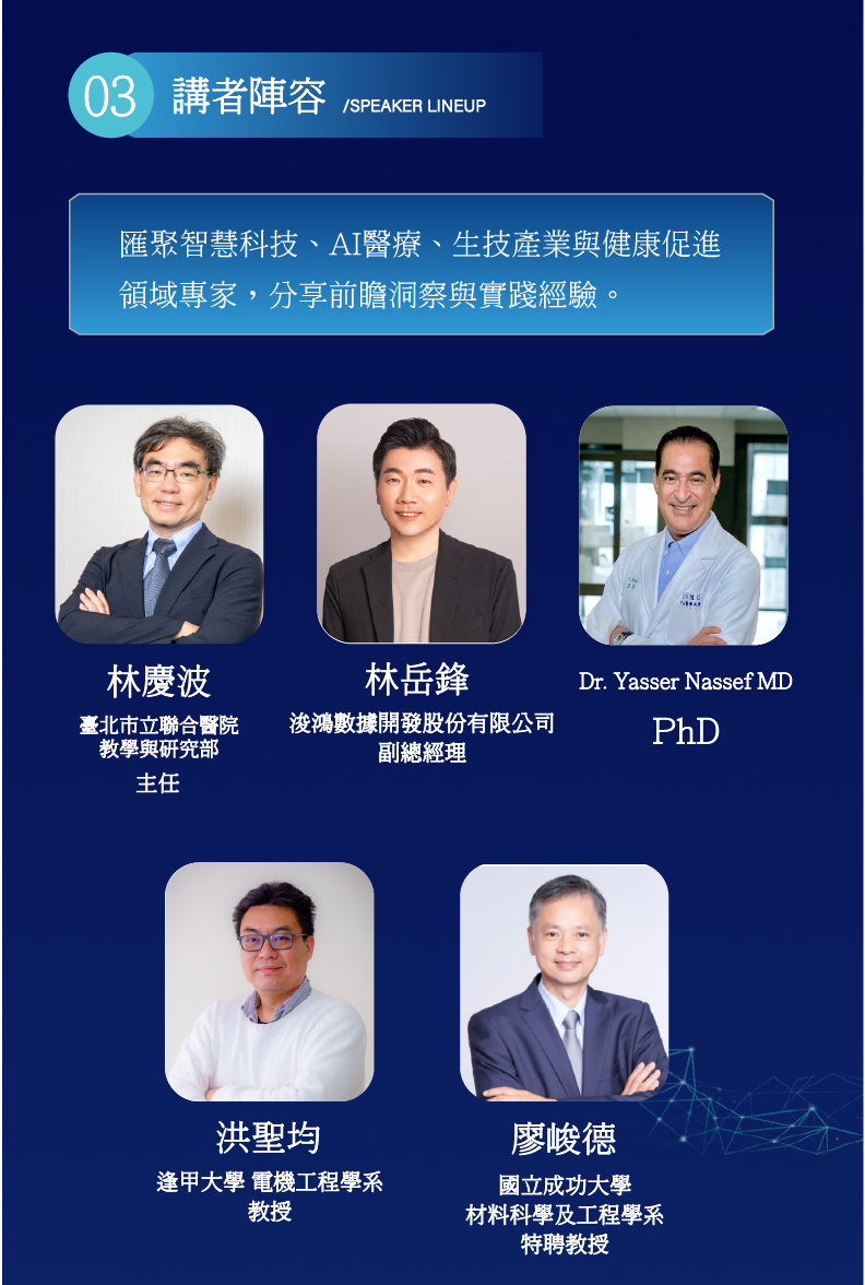 本次研討會邀請五位跨領域專家,從政策、科研、臨床與產業角度解析AI時代的健康新思維: