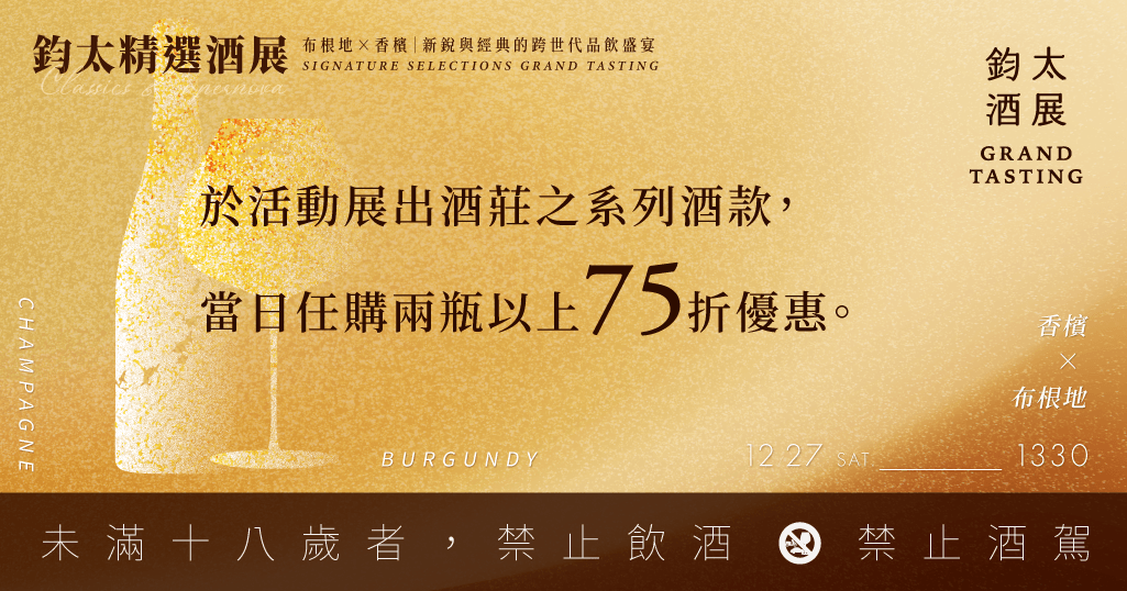 鈞太酒藏Domaine Wine Cellars以布根地與香檳為核心,呈現最貼近全球趨勢的品飲視野,匯聚多家受國際矚目的新銳酒莊與名家之後。全場酒單總價突破十萬元,完整展現從入門到旗艦的品飲層次。無論您偏愛創新活力,或傾心時間淬鍊的經典優雅,這場年度盛會都將帶您一次看見布根地與香檳最具時代性的風貌。