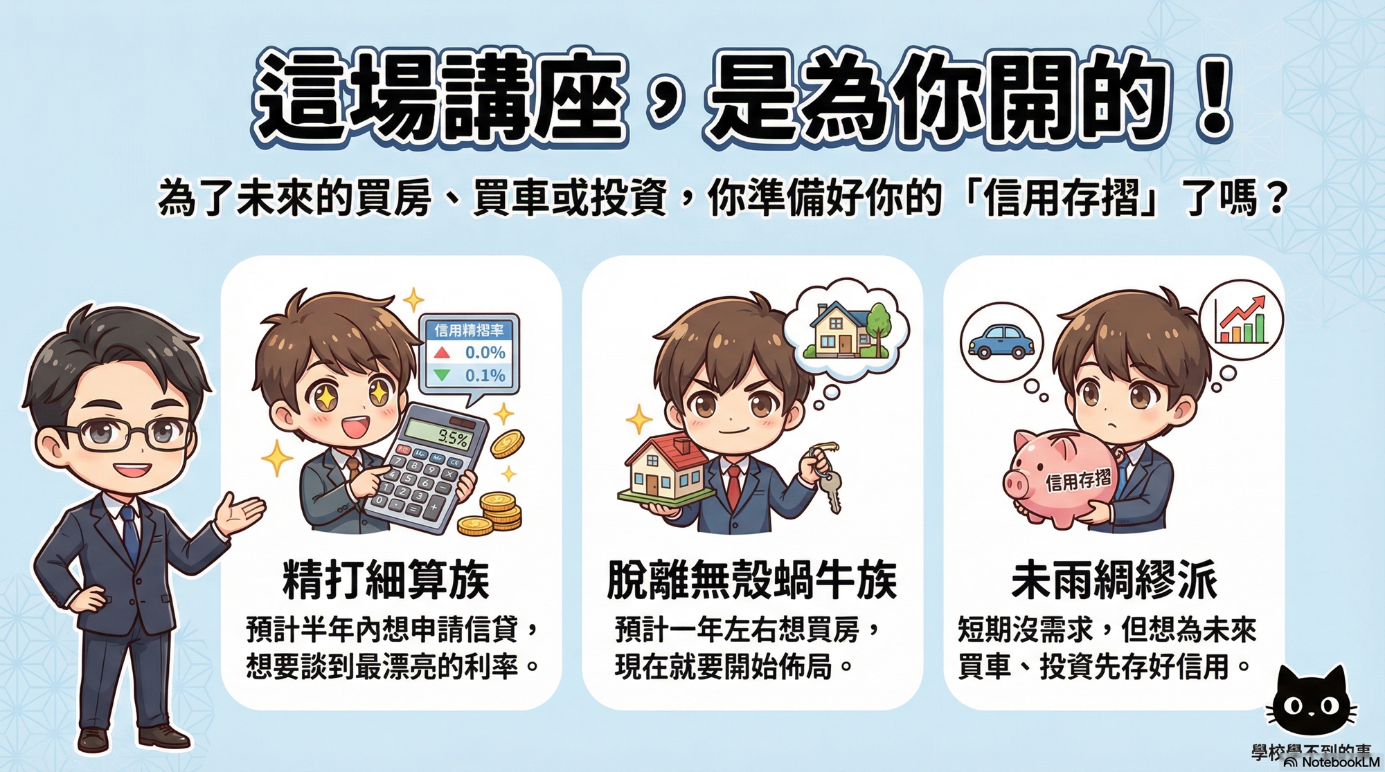 - 未雨綢繆派:短期沒需求,但想為未來買車、投資先存好「信用存摺」。