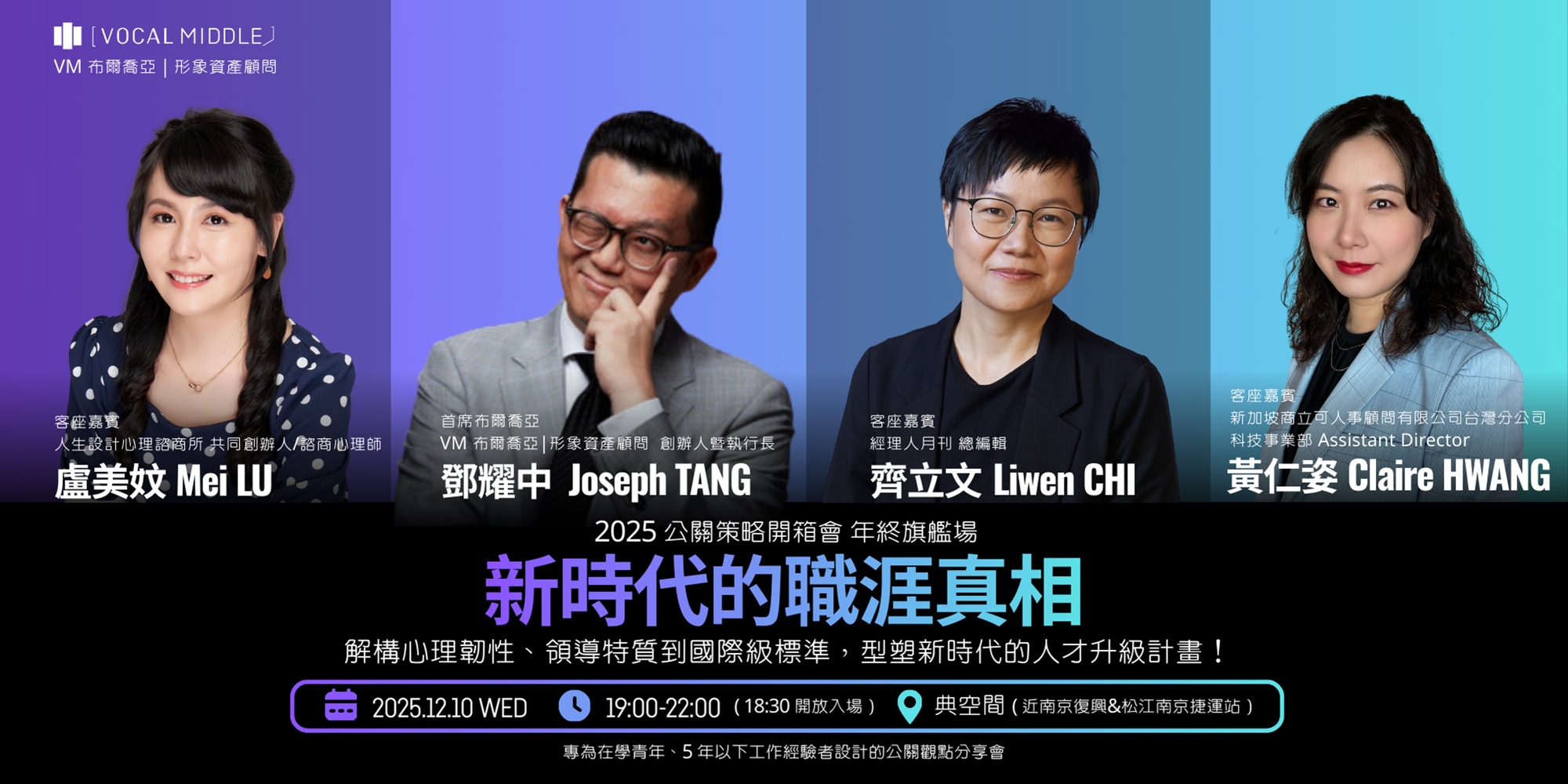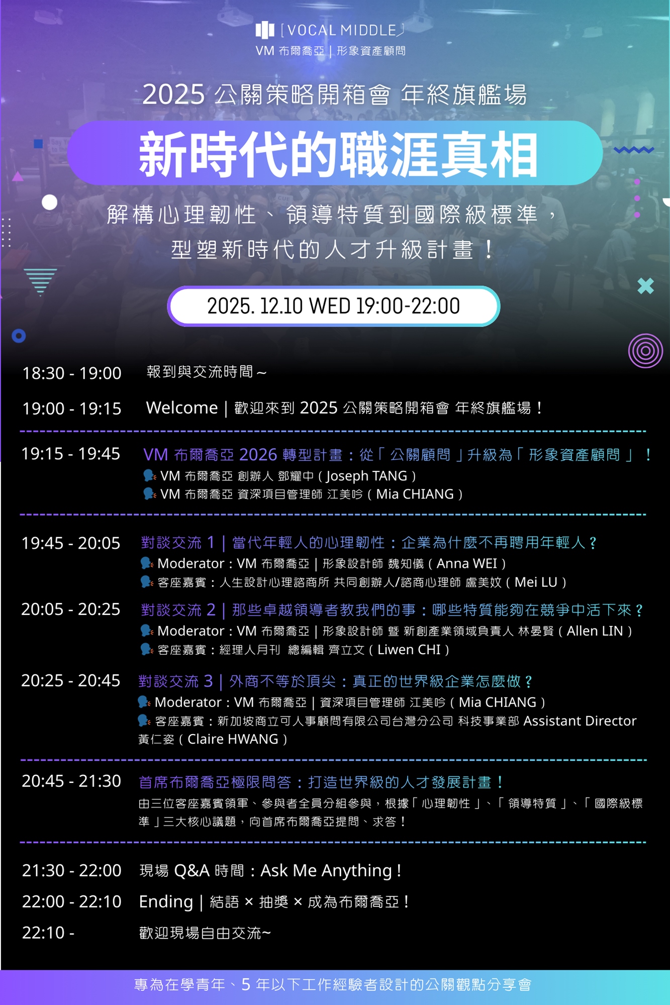 言詞犀利、話風大膽、直言不諱 ── 出身閱人無數的國際獵頭高管,身兼跨域創業者、天使投資人,以及原生 AI 全球化的實務驅動者的Joseph,將在2025年終旗艦場,首次揭露VM從「公關顧問」轉型升級為「形象資產顧問」的全新發展 ── PR Next、VM Academy、人才發展計畫,打造公關產業的未來十年!