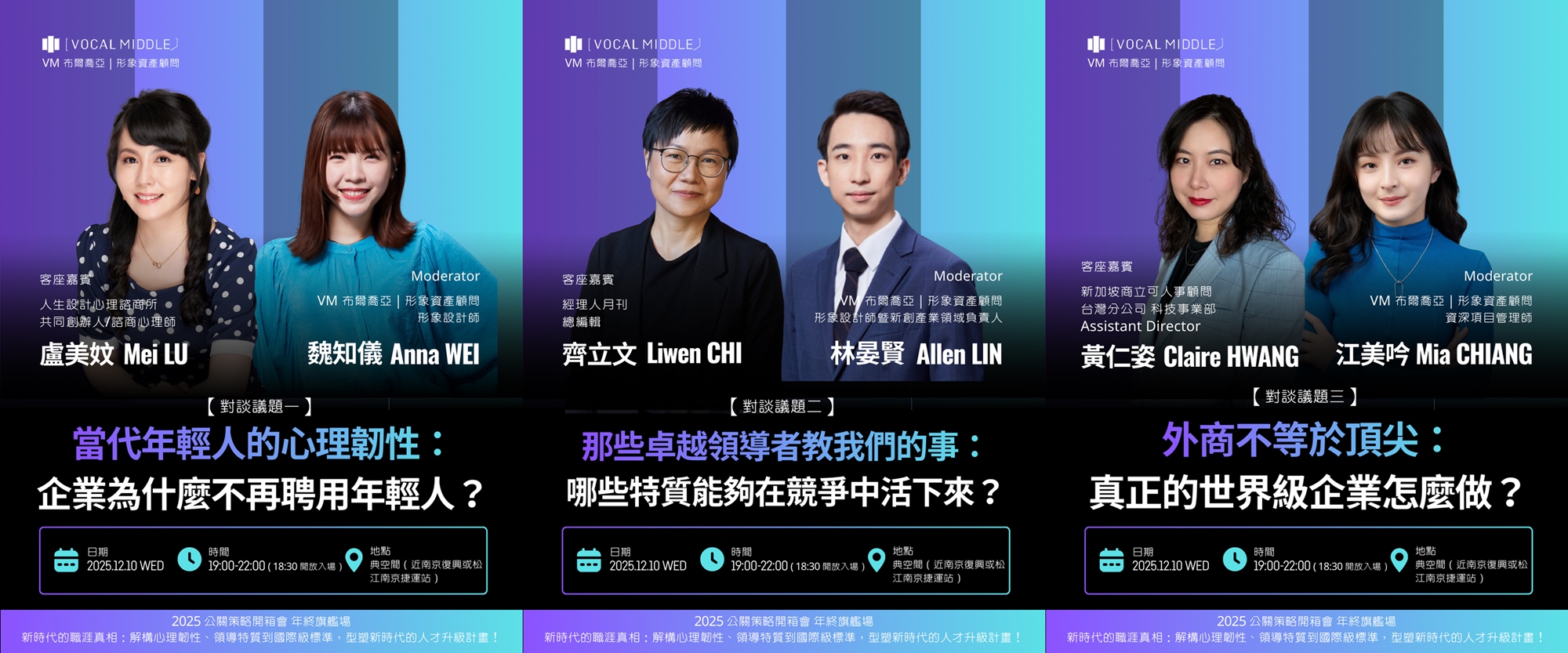今年,VM 布爾喬亞將首度公開轉型升級計畫,並邀請三位專家,以「心理韌性」、「領導特質」與「國際級標準」為題 —— 直球開箱新世代工作者必須面對的「真相」,一起形塑新時代的「人才升級計畫」!