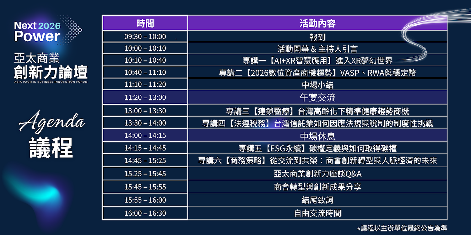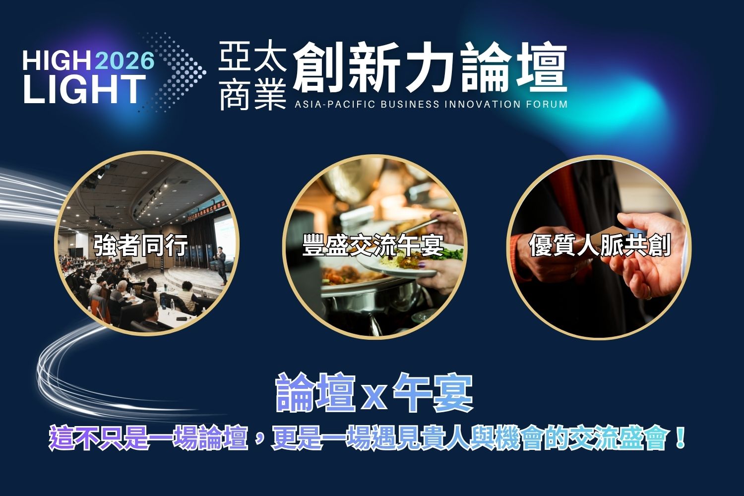 在本次研討會,您將與各產業領袖一同思考、對話,讓創新成為您開創未來的強大引擎,掌握2026商業先機!
