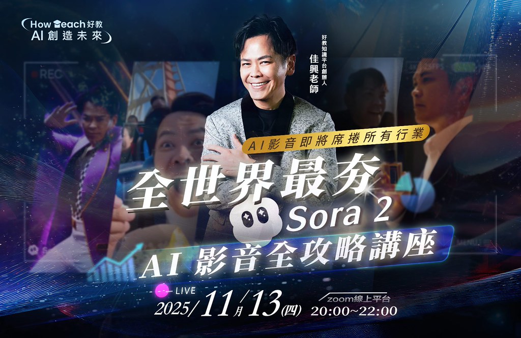 這場講座將帶你深入了解 SORA2 如何結合智慧影音技術,從腳本、影像到行銷應用,幫助你輕鬆打造吸睛內容。