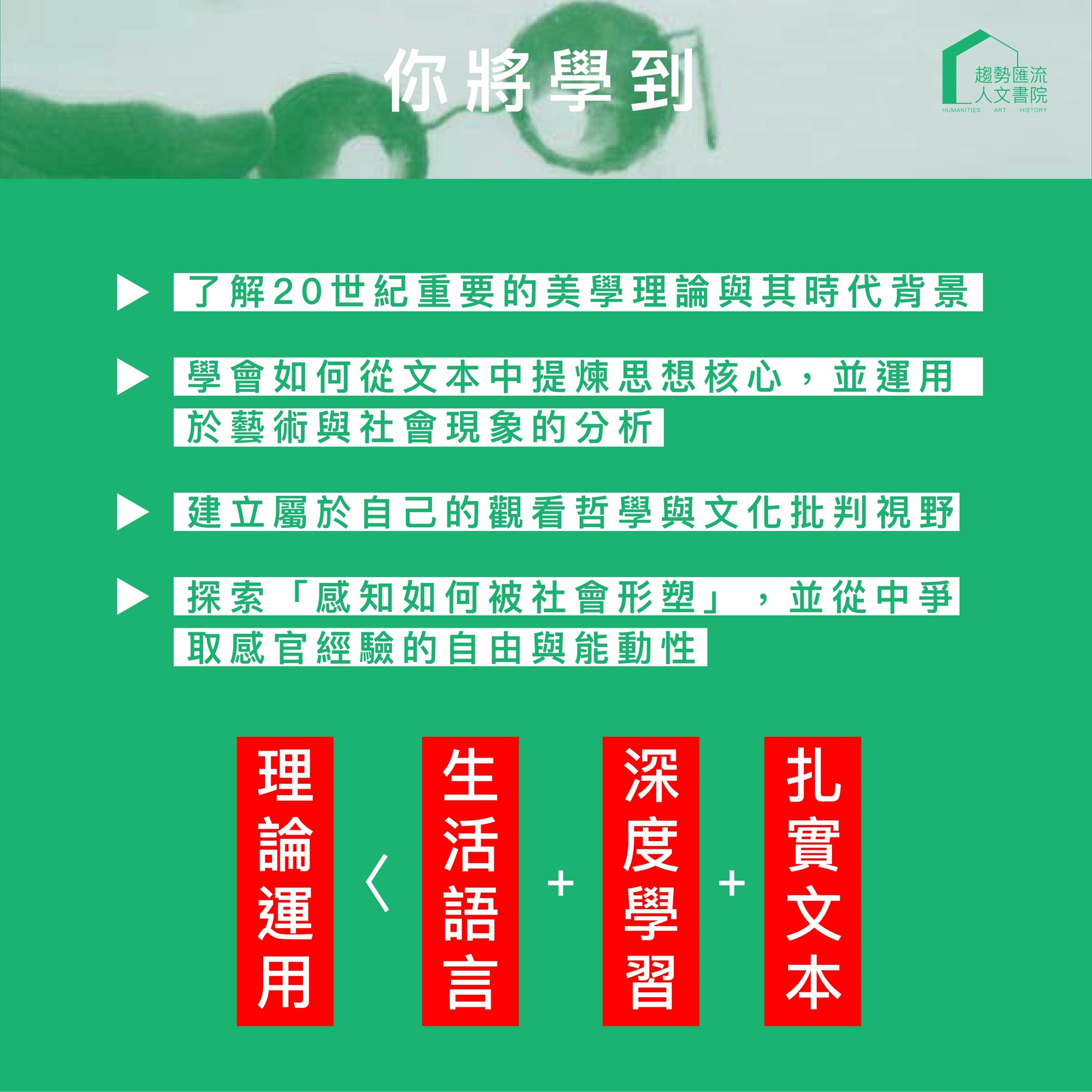 .學會如何從文本中提煉思想核心,並運用於藝術與社會現象的分析