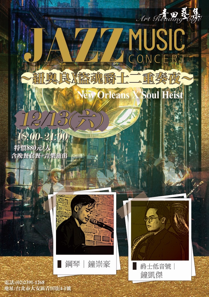 此場音樂會 將由' 爵士兄弟" 留學紐約爵士深造回國的鐘崇豪 和紐奧良留學深造爵士的鐘凱傑 為大家帶回不一樣的 "紐奧良X盜魂爵士二重奏音樂夜"