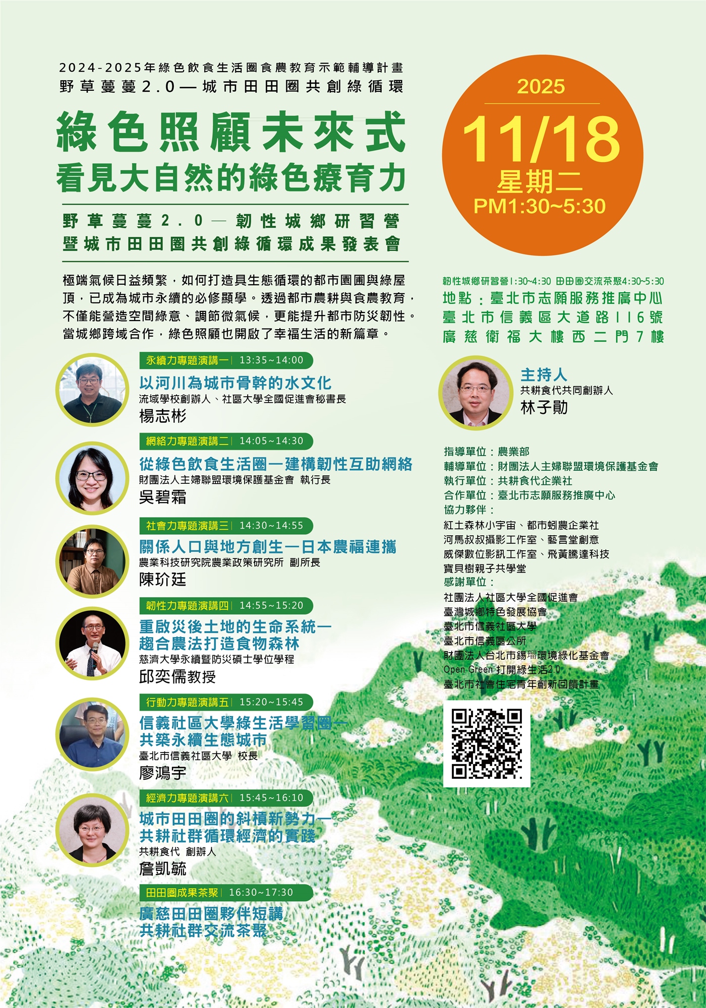 時間:2025年11月18日(二)PM1:30~4:30(研習營) PM4:30~5:30(田田圈交流茶會)