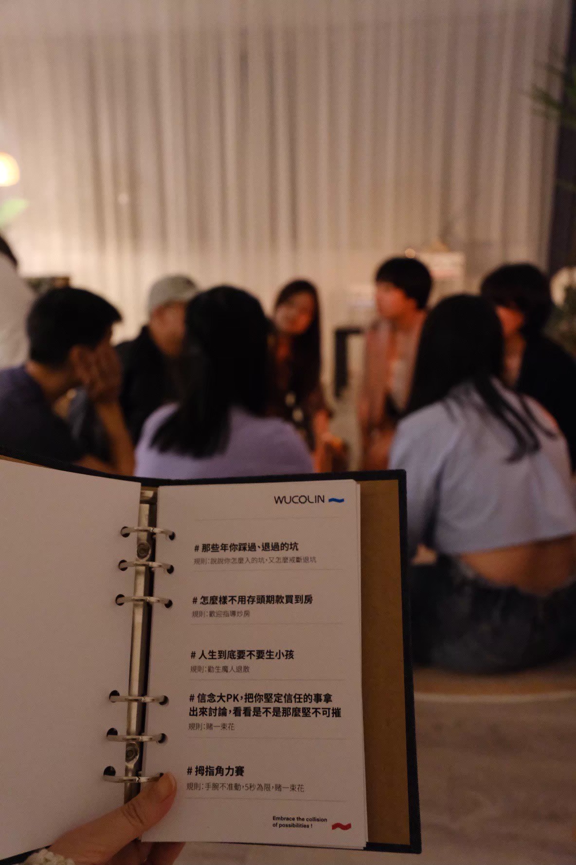 本活動就像一個實驗池,每個現場的陌生人,都是活躍的「粒子」,一起在我們設計的「對撞點」,投入觀點、碰撞,撈取你認知之外的全新可能,讓一切都變得"wucolin"!