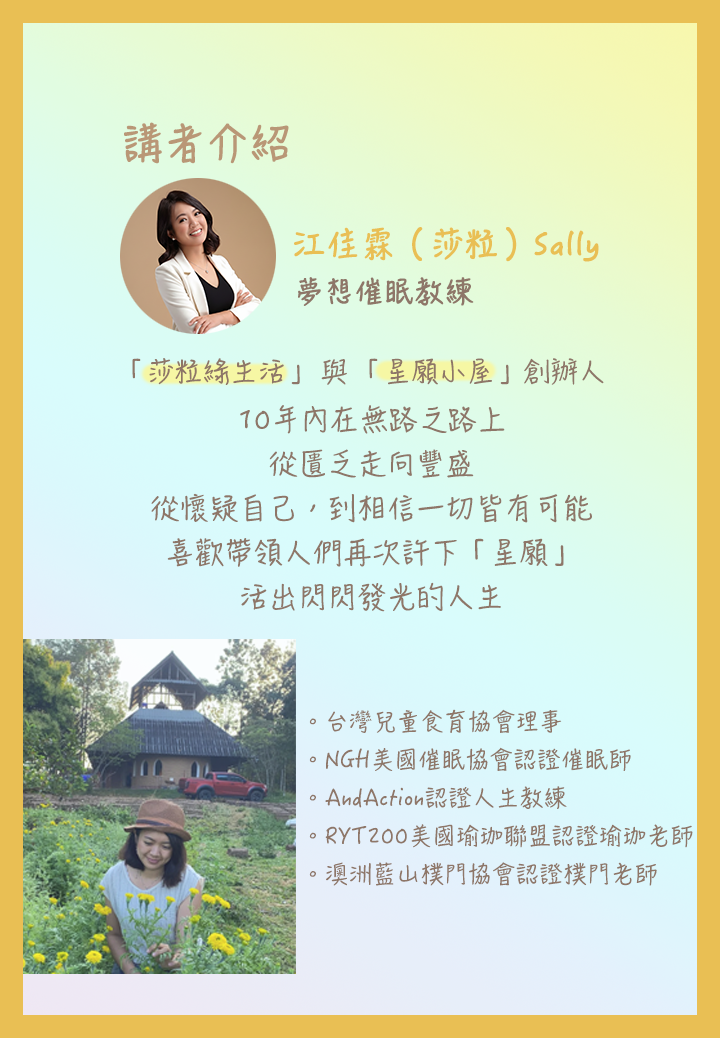 🌱 主講人|江佳霖 Sally(莎粒綠生活/星願小屋・夢想催眠教練)
