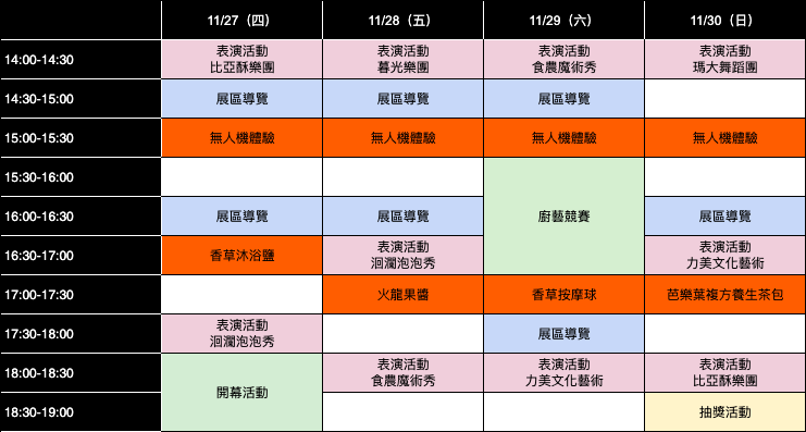 為了讓民眾更實際接觸食農教育,現場設置8場次互動體驗活動,包含無人機灌溉體驗、手作火龍果醬、芭樂葉複方養生茶包及香草沐浴鹽及香草按摩球等多元內容,讓親子可以免費動手體驗農產與自然素材的魅力。本體驗活動僅提供線上預約