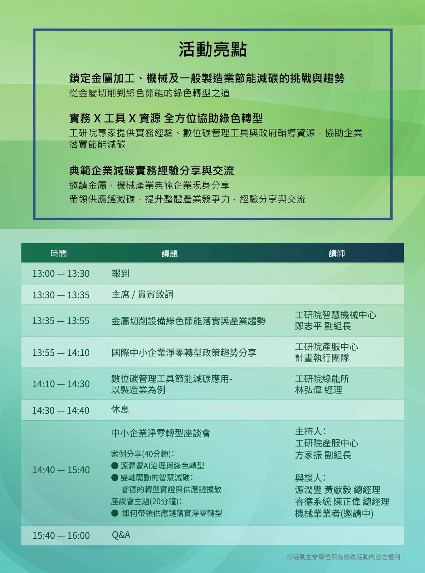 本次說明會邀請產業專家分享如何利用新設備與技術加速落實節能效益;同時安排如何利用數位碳管理工具達到節能減碳之實際應用,協助企業建構永續經營模式。內容涵蓋策略、技術與實務案例,誠摯邀請各界先進共襄盛舉。