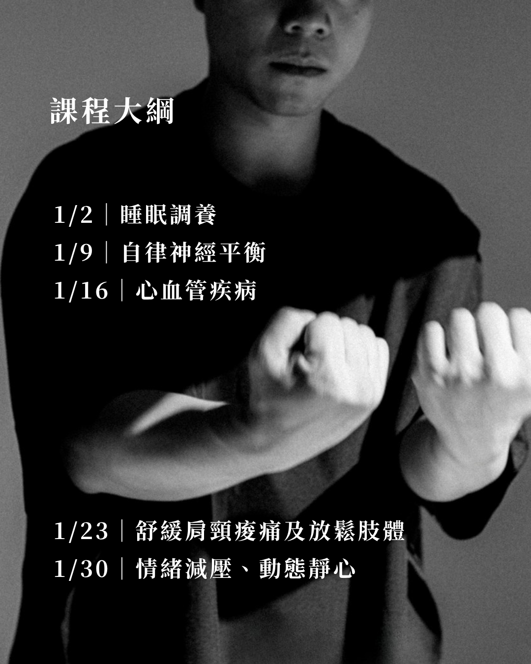 引導你在五堂課中循序探索睡眠、自律神經、情緒與身體緊繃之間的關聯,從最基礎的呼吸、覺察到可立即使用的太極小動作,讓身心逐步恢復柔軟、穩定與清明。