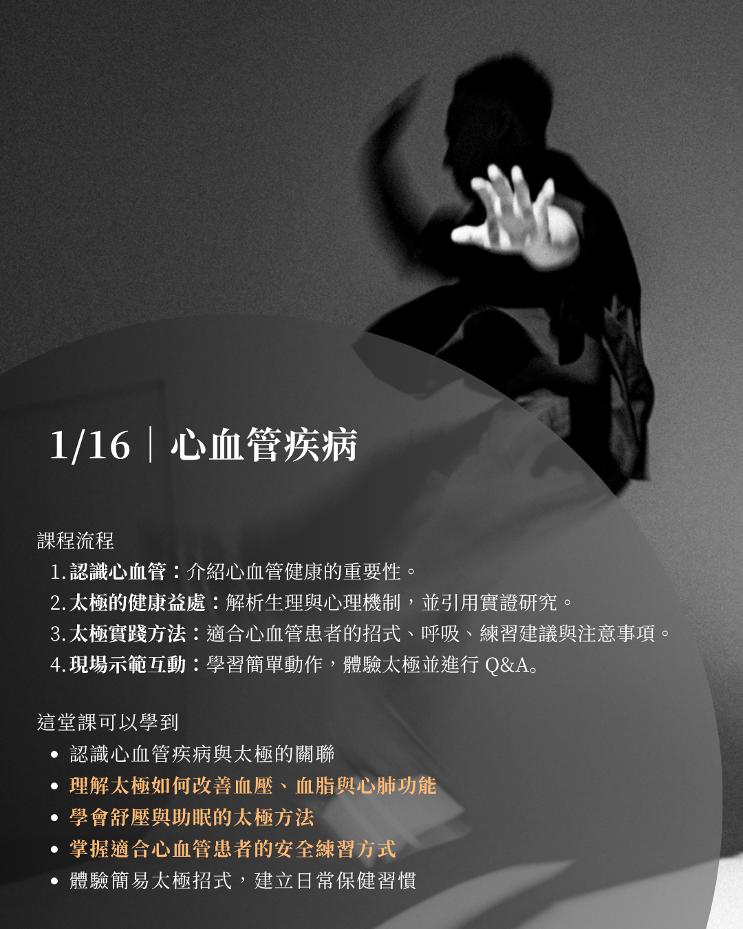 - 現場示範互動:學習簡單動作,體驗太極並進行 Q&A。