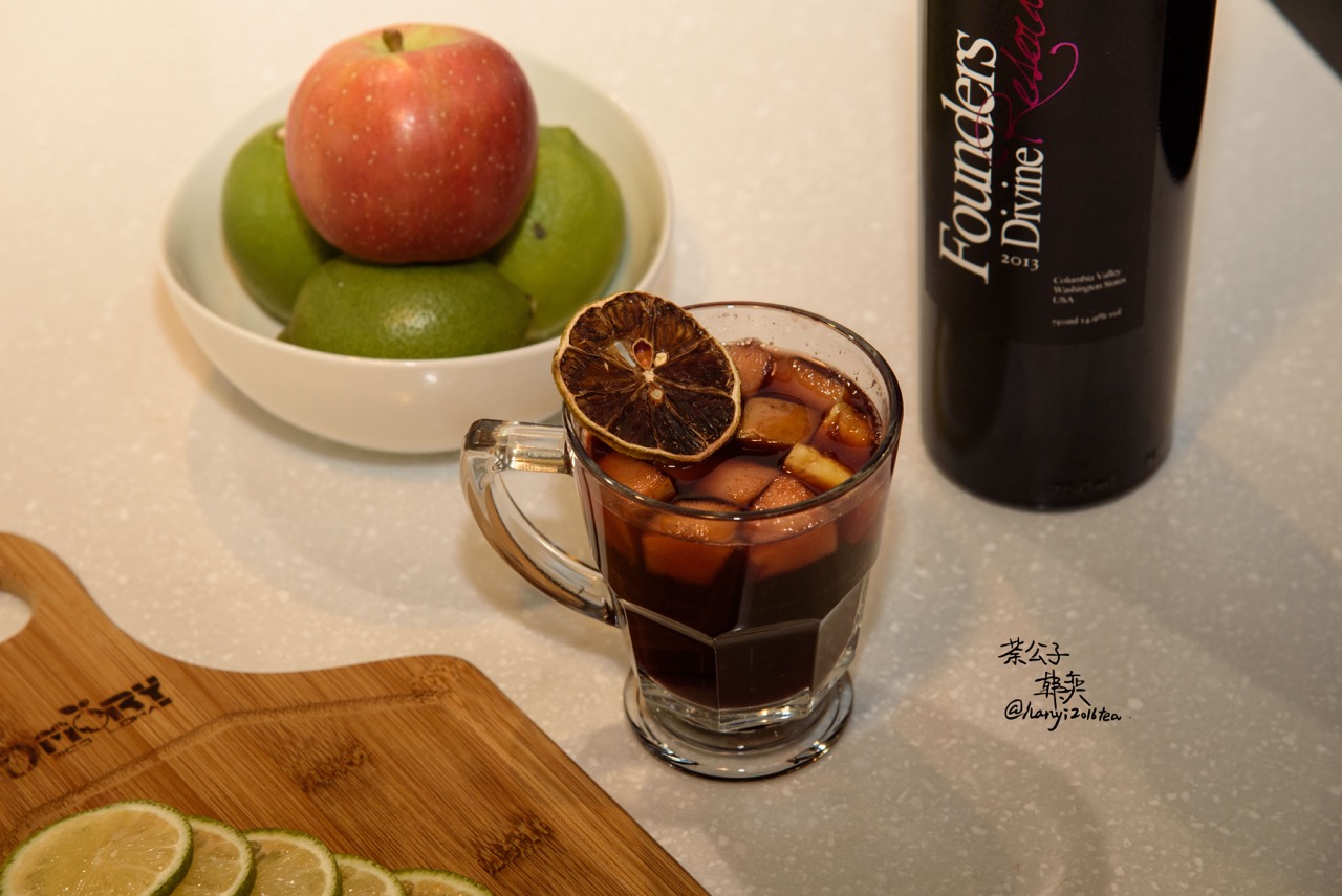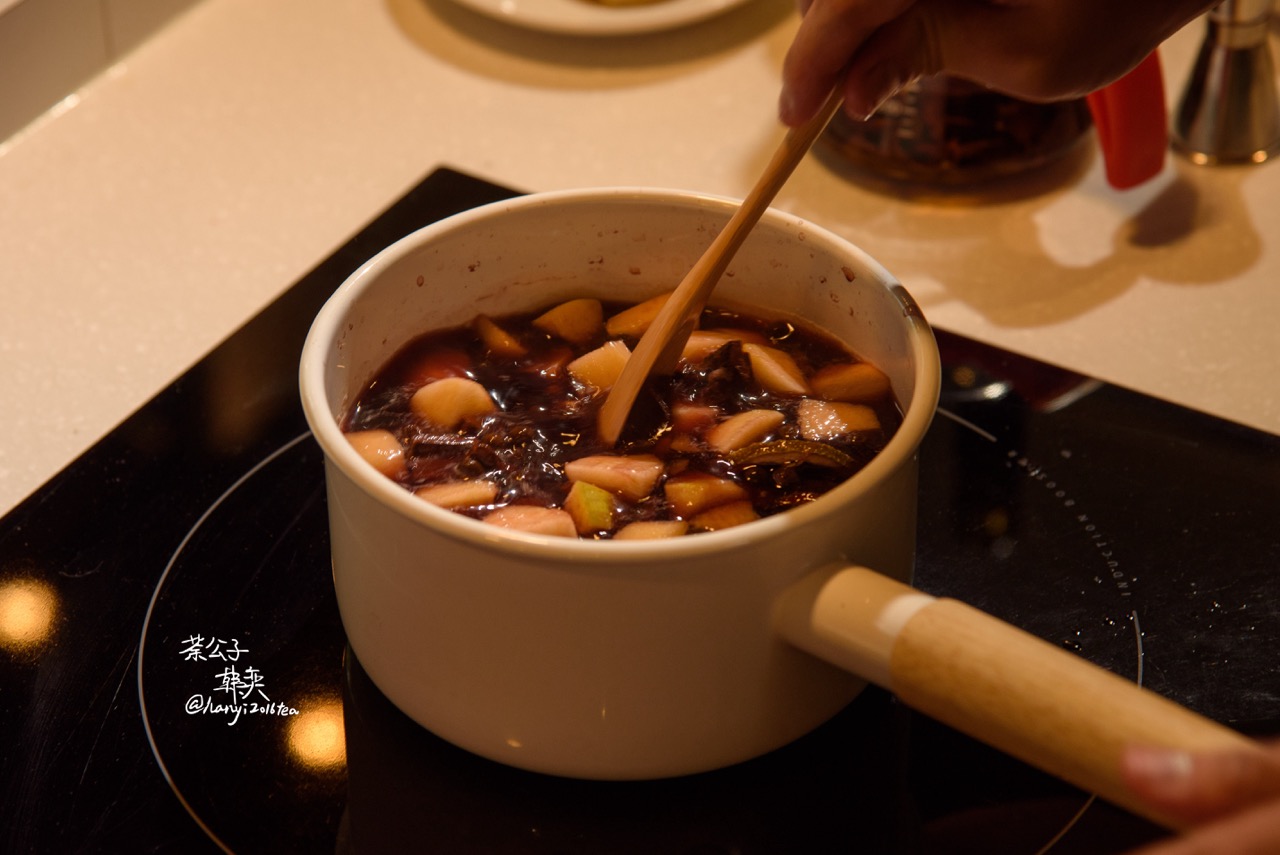 熱紅酒好喝的秘訣除了肉桂、蘋果、柑橘,擁有變化、耐喝的質感,必定需要加入茶葉。自古熱紅酒的煮法上百種,每種配方因地域性才料上獲取不同,整體配方不便的情形下,把喝不完、純飲上不夠滿意的紅酒,再以烹煮加工的方式,做出既有甜蜜又溫暖的熱甜酒,荼公子嘗試作數百款配方後,得出的結論與「潘趣酒 Punch」的概念接近,要好喝的熱水果酒必須要具備:酒、糖、檸檬、水、茶葉,共五大要素。