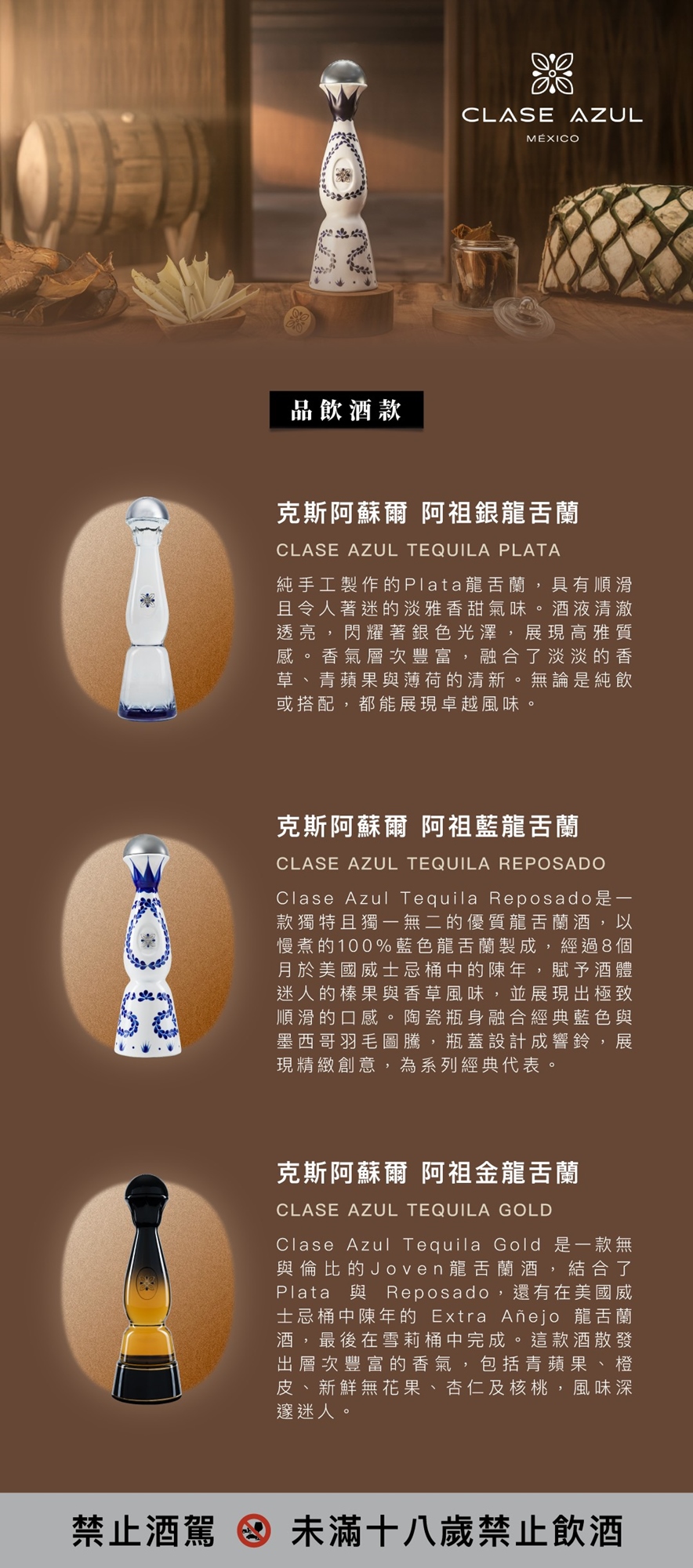 Clase Azul 阿祖龍舌蘭,被譽為「龍舌蘭界的愛馬仕」。以100%藍色龍舌蘭釀製、於墨西哥哈利斯科州波本桶熟成,酒體醇厚香郁。其瓶身由工匠手繪陶瓷打造,結合藝術與品味,是收藏與品酩者心中的經典。活動中,烈酒講師珮喻將帶領您品味三款經典佳釀,感受其獨特魅力與極致風味。