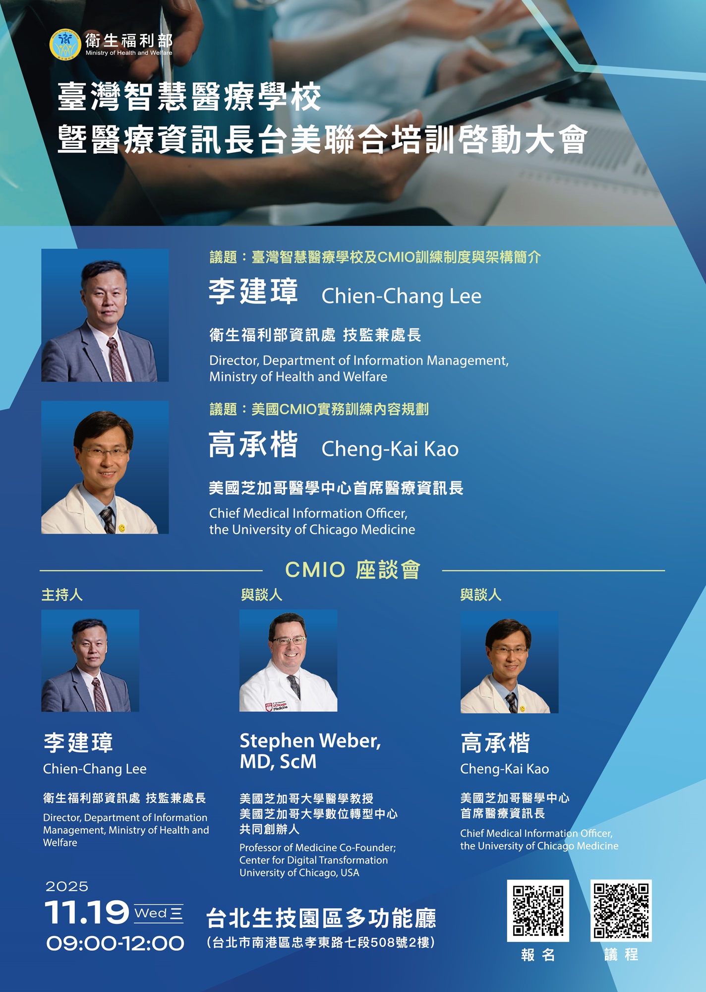 隨著全球醫療邁入智慧化與資料驅動的時代,跨國醫療合作與高階醫療資訊人才培育已成為智慧醫療發展的核心。衛生福利部資訊處將於 114年11月19日(星期三) 舉辦「 臺灣智慧醫療學校暨醫療資訊長台美聯合培訓啟動大會」。