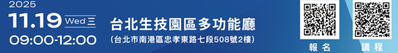 • 地點:台北生技園區多功能廳 (台北市南港區忠孝東路七段508號2樓)
