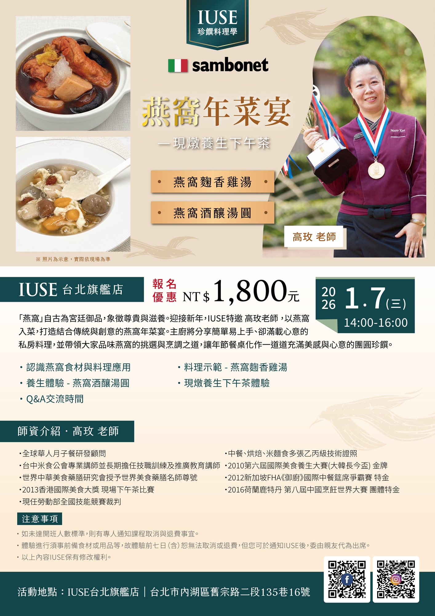 「燕窩」自古為宮廷御品,象徵尊貴與滋養。迎接新年,IUSE特邀 琉元堂 高玫老師,以燕窩入菜,打造結合傳統與創意的燕窩年菜宴。主廚將分享簡單易上手、卻滿載心意的私房料理,並帶領大家品味燕窩的挑選與烹調之道,讓年節餐桌化作一道道充滿美感與心意的團圓珍饌。