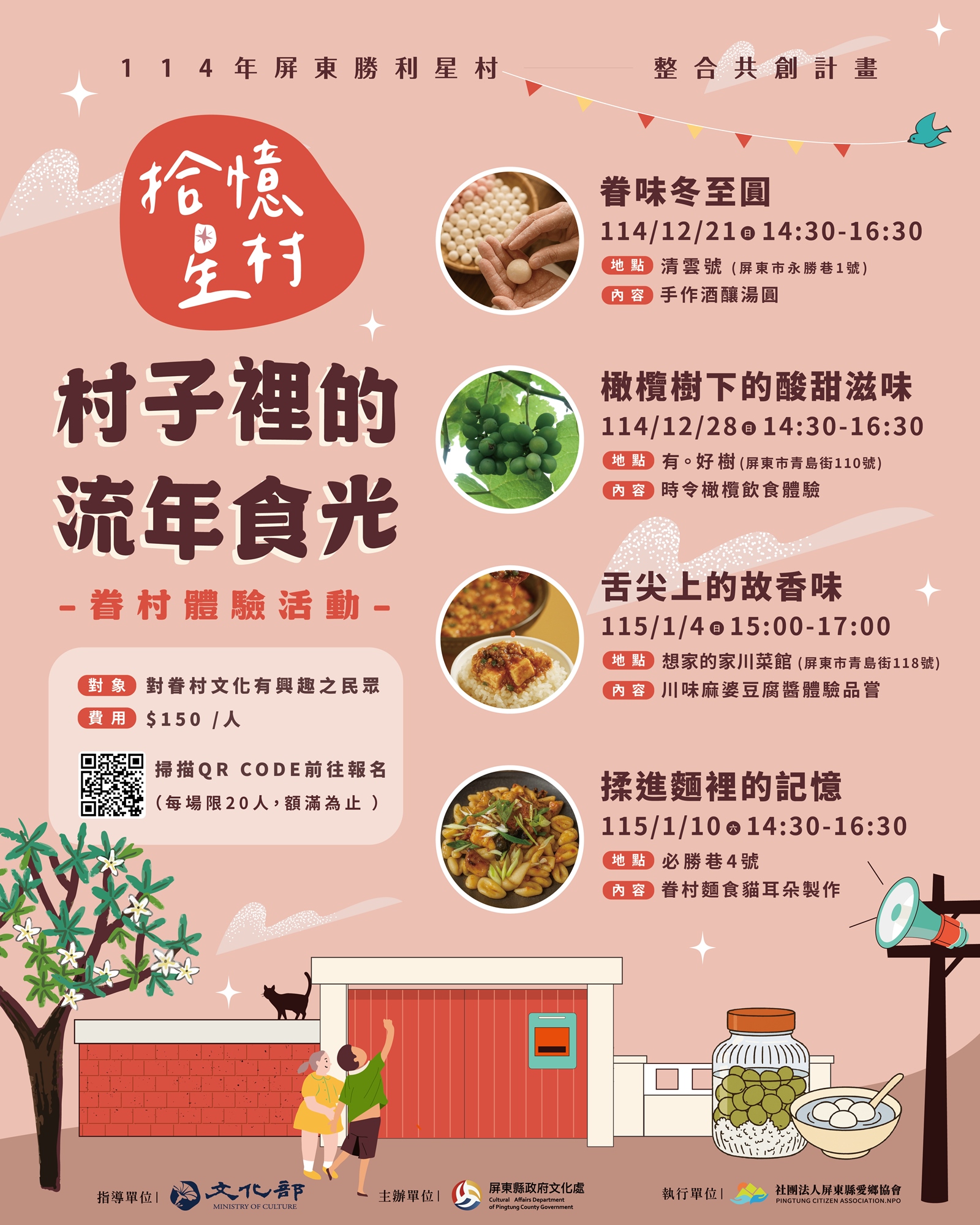 本次「拾憶星村:村子裡的流年食光」系列活動,以 屏東勝利星村創意生活園區 為核心場域,規劃四場不同主題的飲食文化體驗,透過 飲食體驗 × 記憶故事分享 ,引領參與者在味道、故事與互動中,感受眷村文化的溫度。