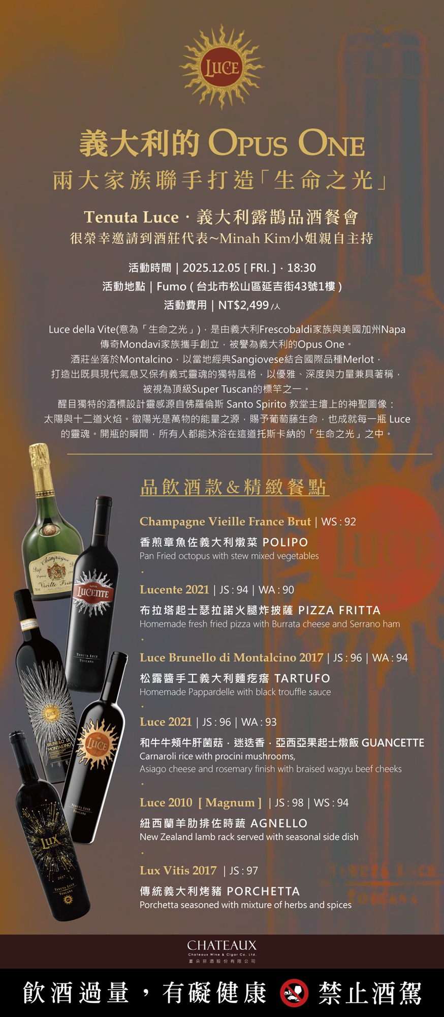 本次品酒會夏朵菸酒非常榮幸地邀請到酒莊代表Minah Kim小姐,親自帶領您一同品酩。精選1款香檳、5款紅酒,總價值超過$20,000的酒款,與主廚客製化精心準備的餐點完美搭配。