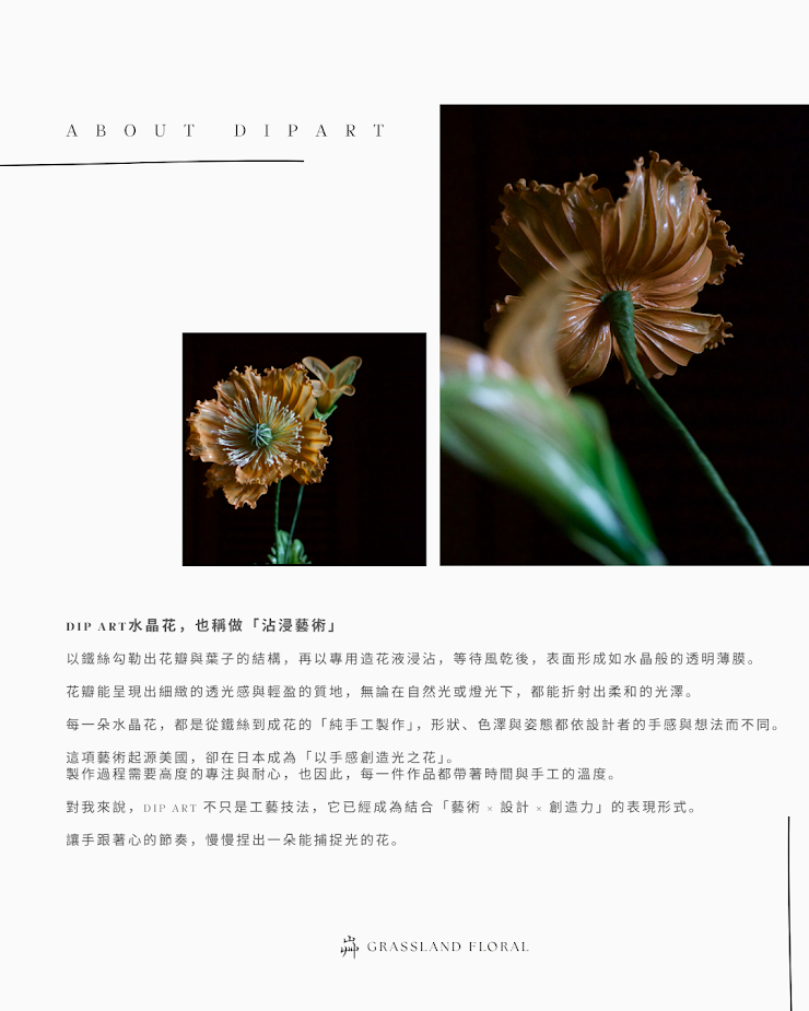 讓心沉靜下來,留一段時光與自己相處,當透明薄膜在指尖凝成花形、折射出柔軟光澤的那一刻,您將帶走的,是一件屬於自己的小小藝術品,也是一段安然綻放的記憶。
