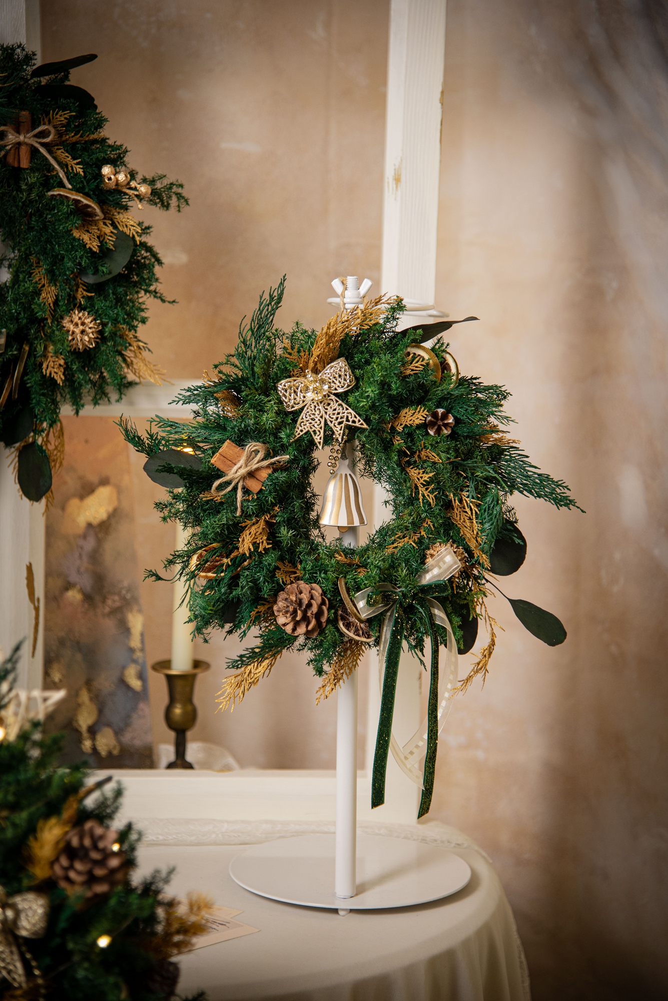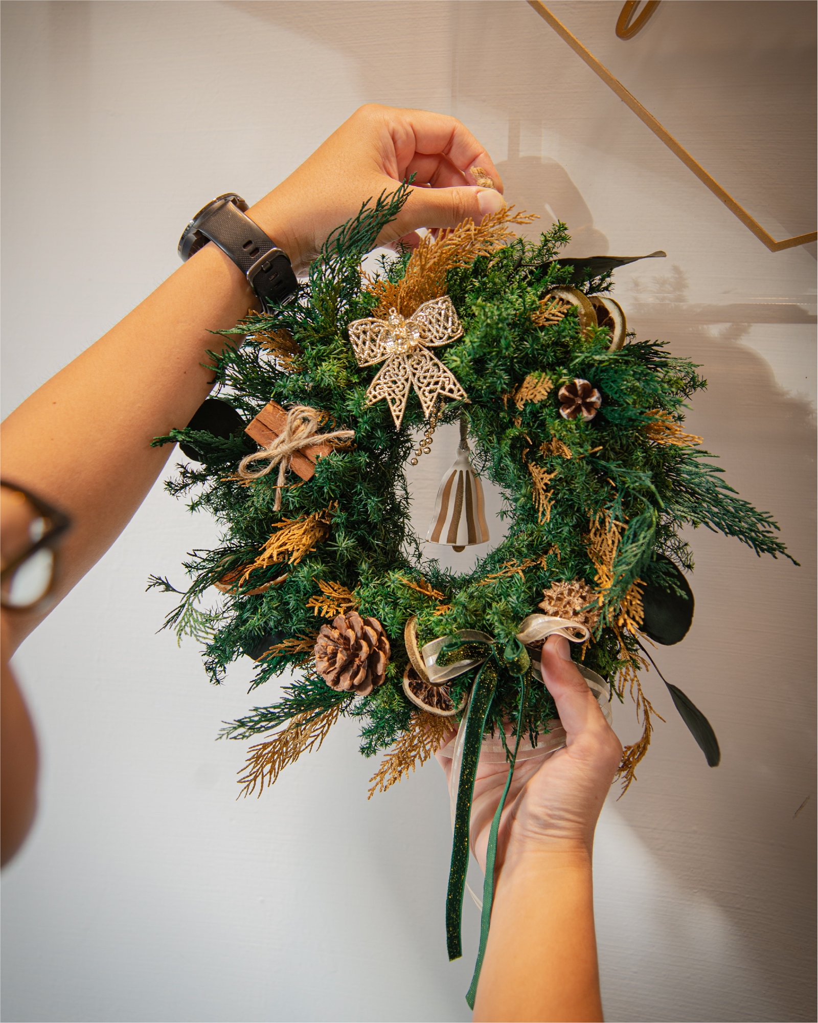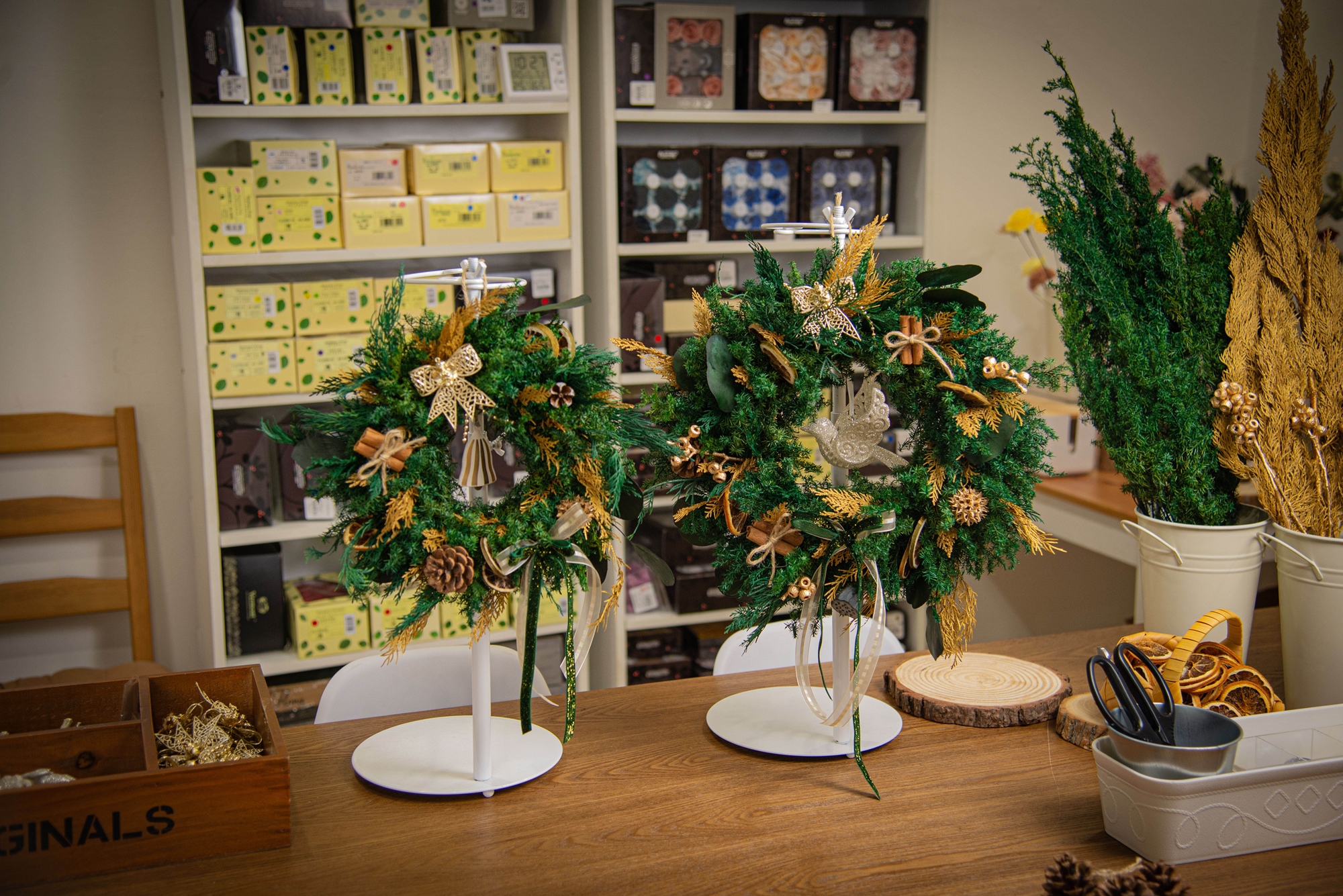 ◎作品創意實作:現場有不同果實與飾品,可自由搭配,創作出自己的聖誕花圈。
