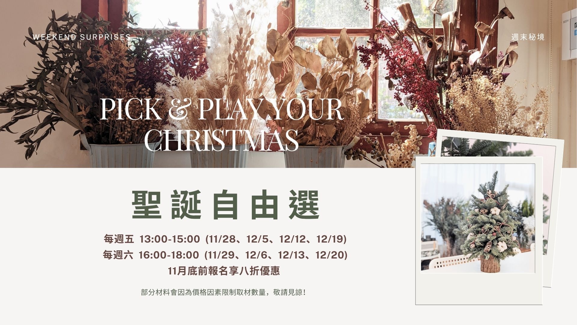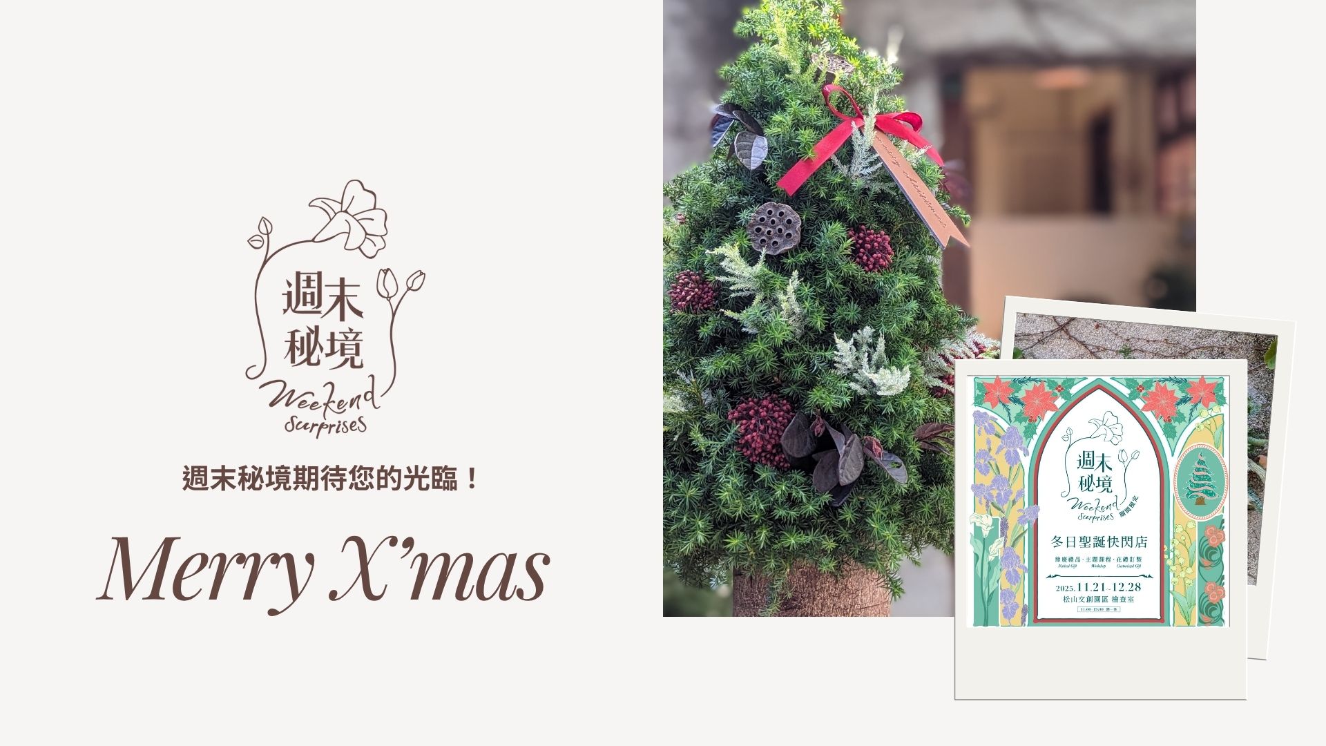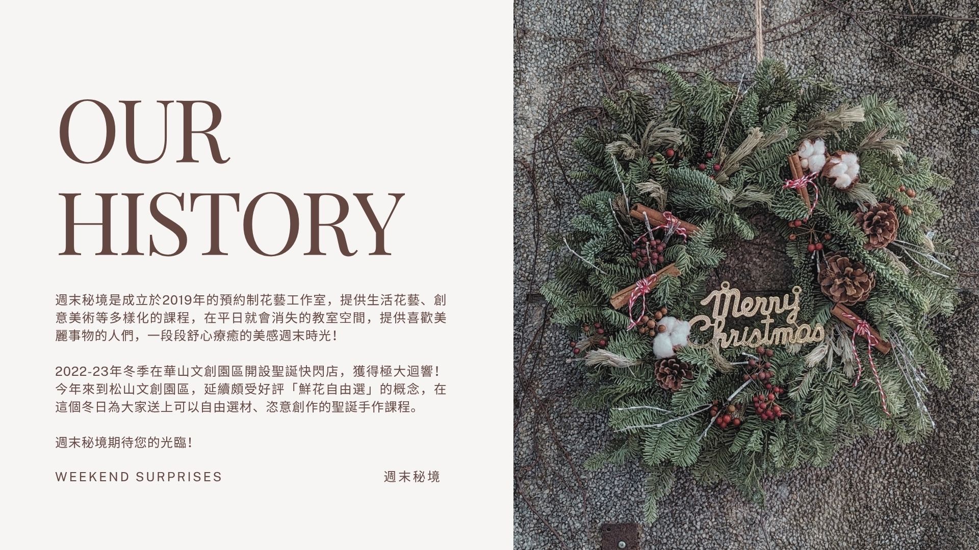 週末秘境是成立於2019年的預約制花藝工作室,提供生活花藝、創意美術等多樣化的課程,在平日就會消失的教室空間,提供喜歡美麗事物的人們,一段段舒心療癒的美感週末時光!2022-23年冬季在華山文創園區開設聖誕快閃店,獲得極大迴響!今年在松山文創園區,延續頗受好評「鮮花自由選」的概念,在這個冬日為大家送上可以自由選材、恣意創作的聖誕手作課程。