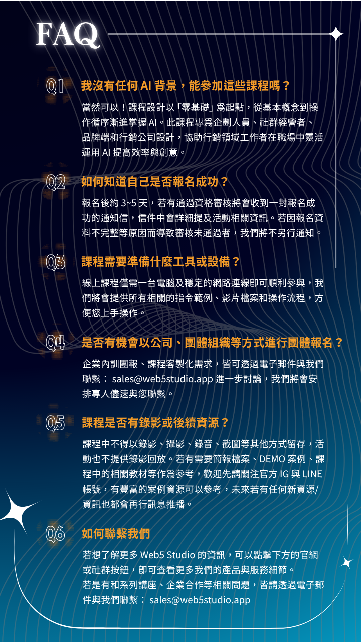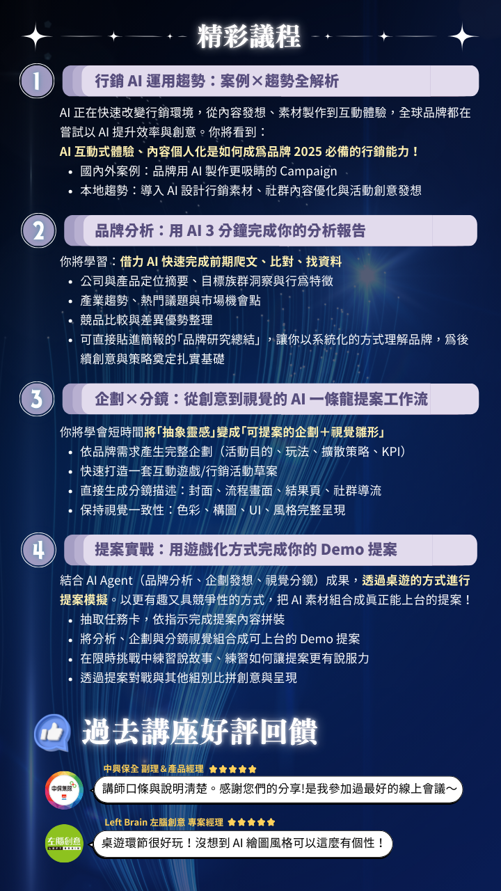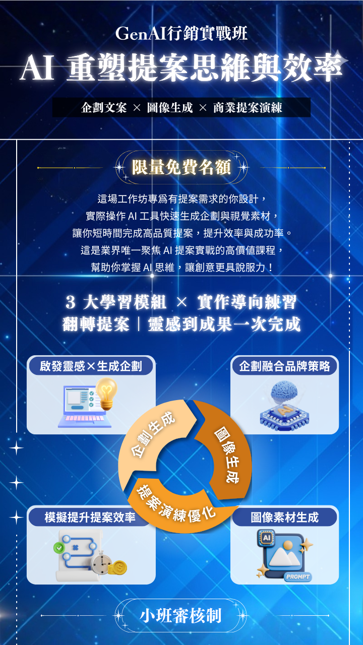 這場 AI 行銷實戰工作坊 為你準備了一套「一條龍的 AI 提案流程」,讓你在短時間內學會如何用 AI 加速思考、生成內容、打造視覺並完成 Demo 提案。即使你沒有任何 AI 基礎,也能一步步完成屬於自己的作品。