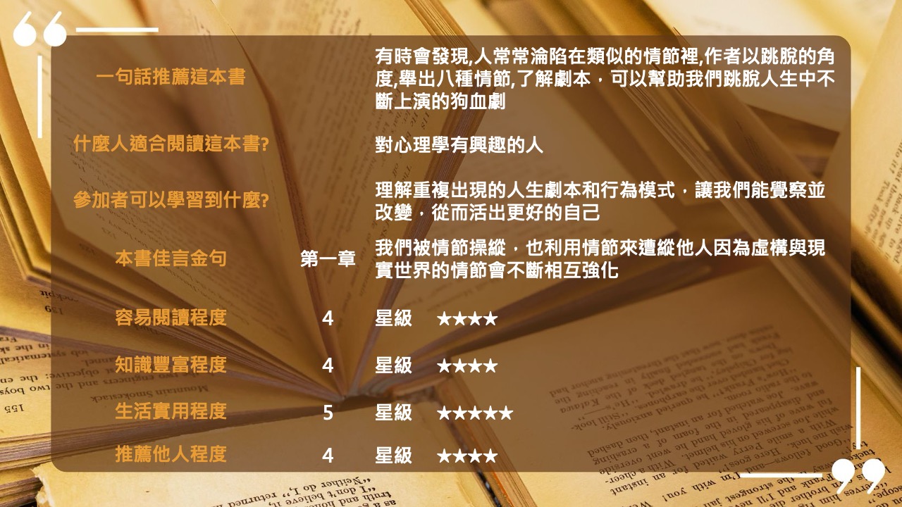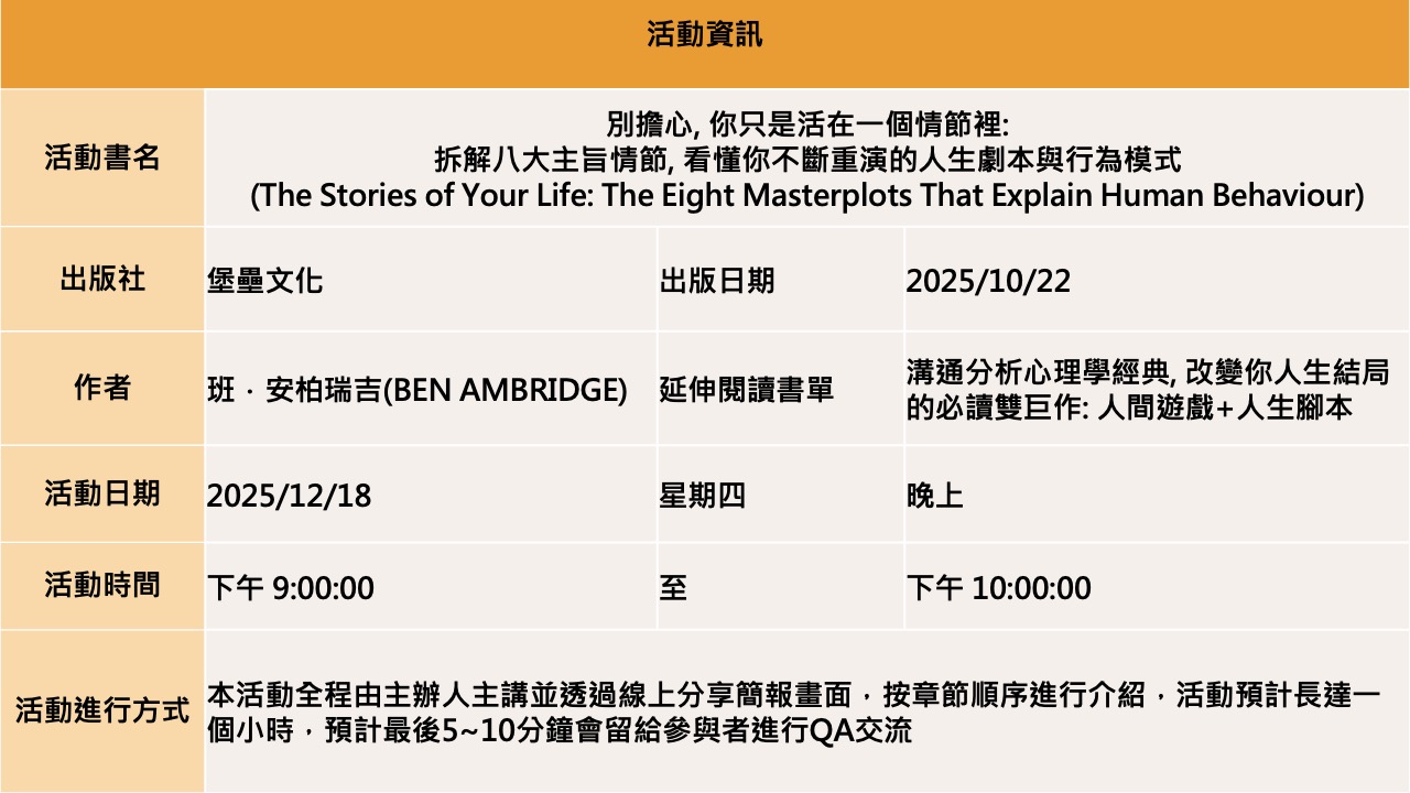【BookBook預約線上讀書會】別擔心,你只是活在一個情節裡:拆解八大主旨情節,看懂你不斷重演的人生劇本與行為模式