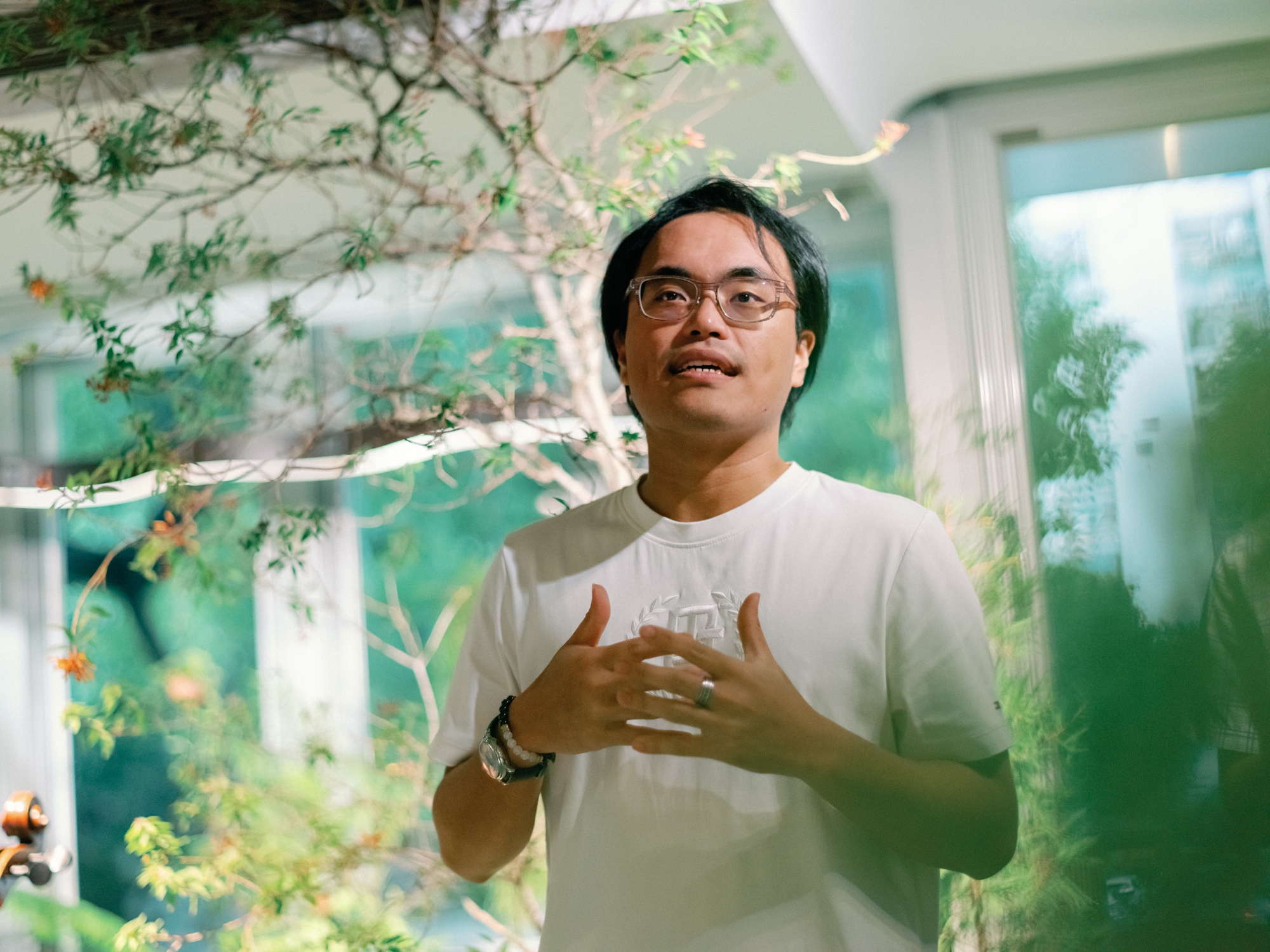 洪睿晉(Justin)是「梧樹森林空間」的設計總監,對植物充滿熱愛,在過去曾經發現新種植物並以洪睿晉(Justin)的名字命名。目前除了擔任許多企業的綠化顧問,經手過的景觀設計案件也已經不下百件,從單一空間內植栽擺設、室內整體的植栽設計、室外花園或陽台的植栽規劃到商業空間的整體植物景觀設計,所有和植物養護及植物佈置有關的疑難雜症,洪睿晉(Justin)都能解決,更是許多名人、藝人的御用植物景觀設計師。