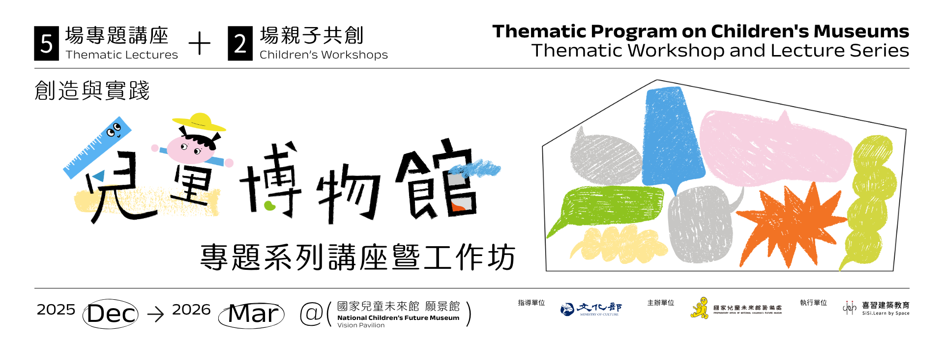 12月開始到明年3月,國家兒童未來館籌備處將舉辦「兒童博物館」專題活動。邀請兒童、藝術、博物館等領域的講者,從「表意」到「共融」,從理念到實務,帶領大家理解兒童博物館的核心精神——讓聆聽化為行動,讓參與化為設計。