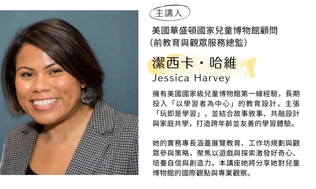 - 主講人:美國華盛頓國家兒童博物館顧問(前教育與觀眾服務總監)潔西卡・哈維(Jessica Harvey)