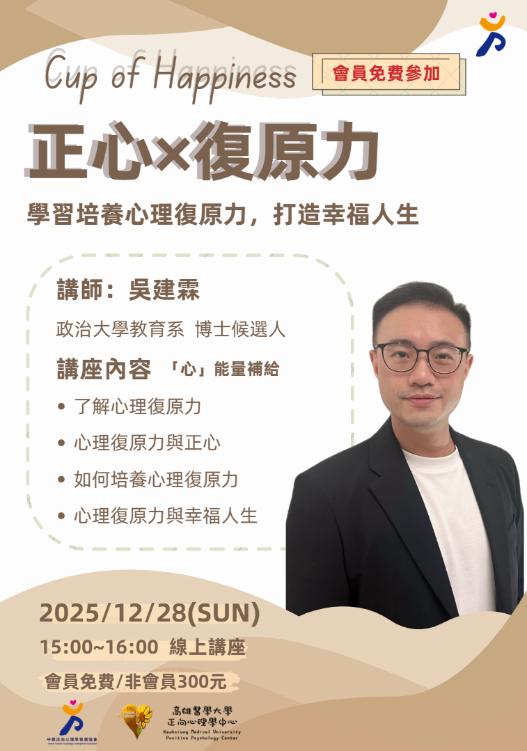 正心下午茶為中華正心協會的會員專屬福利活動~每個月固定一場,講座時長為一個小時!在2025年12月份,我們邀請到吳建霖講師,以「正心x復原力」為題,帶我們重新認識心理的韌性。🤩ˊ