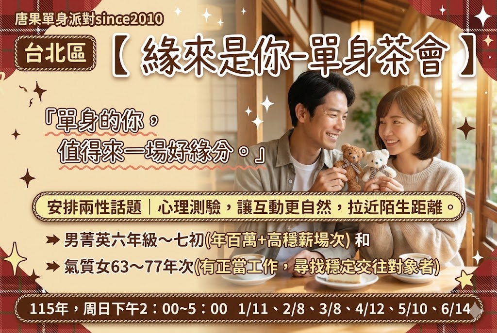(台北幸福聯誼)02/08(日)14:00「戀愛ING-單身交友茶聚」男菁英六年級~七初+氣質女63-77年次(台北交友|台北相親|單身聯誼|菁英聯誼|未婚二春伴侶|相親|月老|媒人)