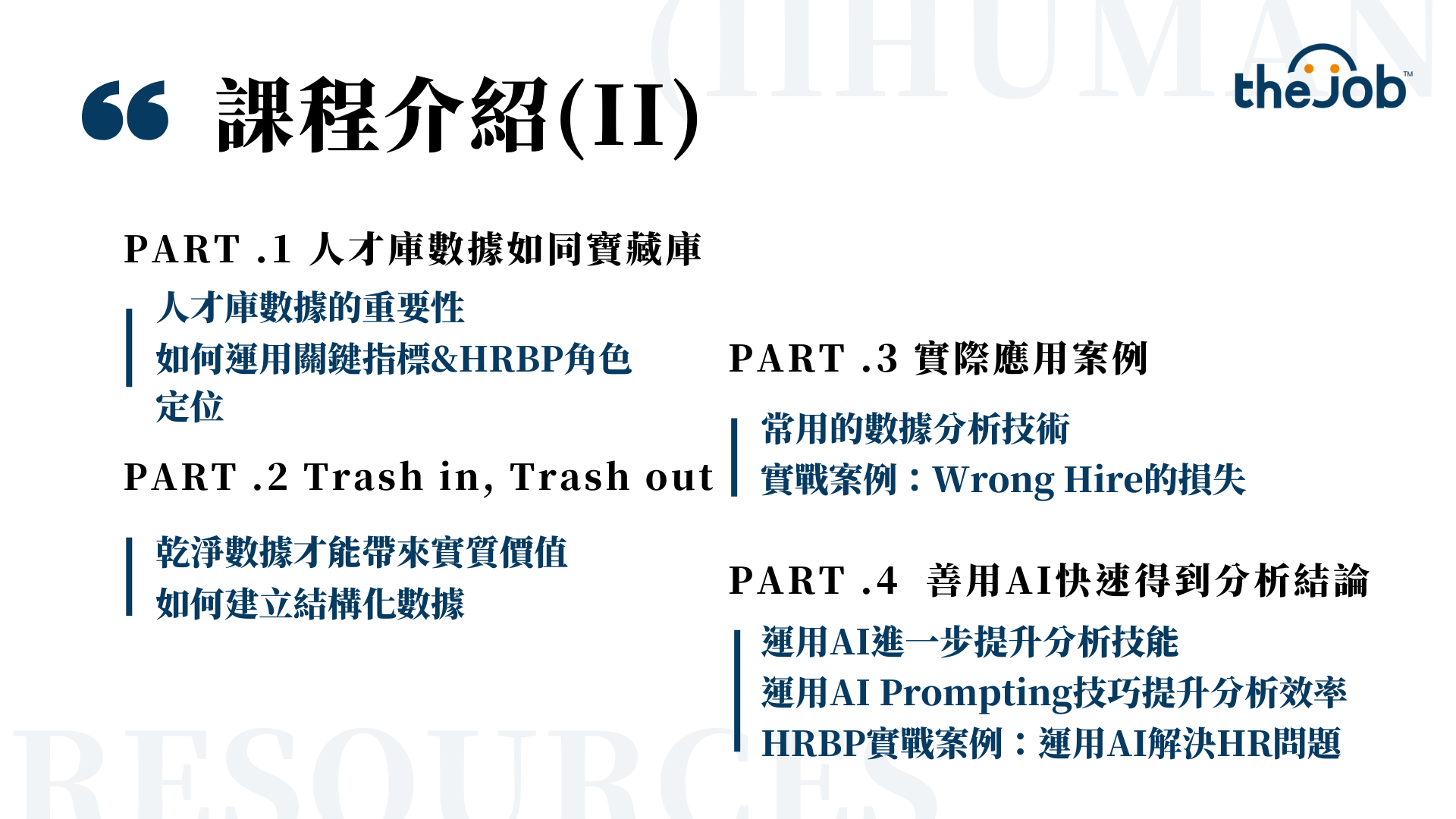 此外,擁有豐沛人才庫的企業人資,藉由數據分析與AI應用,掌握人才吸引、人才培育以及人才留任的關鍵邏輯,進而成為更懂商業、更懂數據的人資企業夥伴(HRBP)。