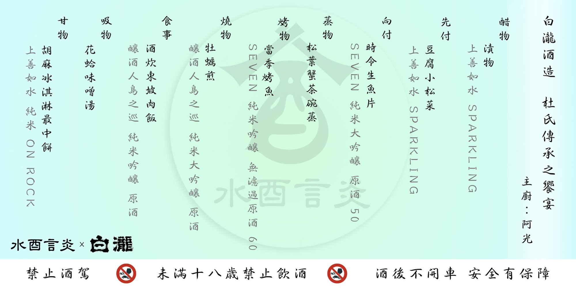 2018年1月 白瀧酒造的杜氏「山口真吾さん」,踩著腳踏車從基隆富貴角到墾丁鵝鑾鼻,完成單車環半島的雙塔之旅。感受台灣的豔陽、雨水、風土、熱情,並以這趟旅程為靈感,釀造出《上善如水.釀酒人島巡り》。
