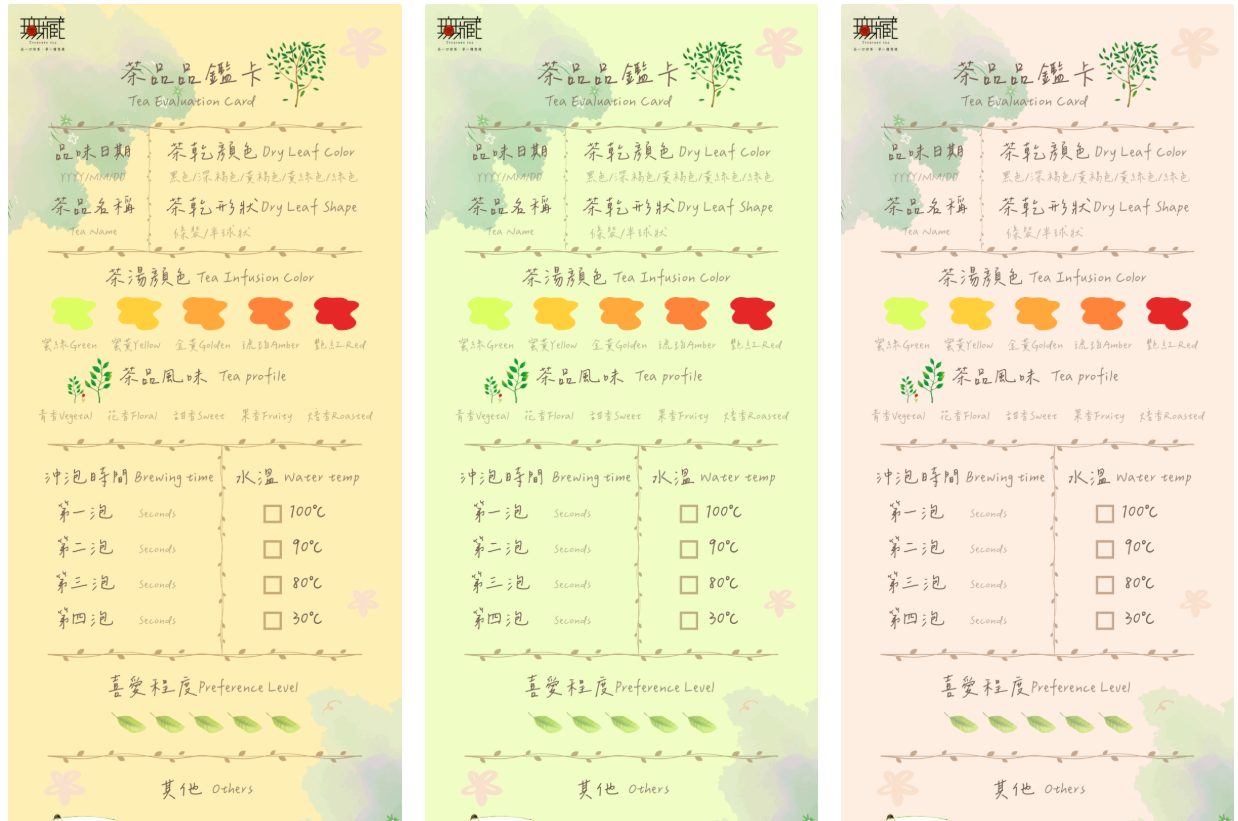 ※※ 茶品品鑑筆記卡讓使用者能在品茶過程中,系統化地記錄下每一次所品嘗的茶款、茶乾顏色、茶湯顏色、茶品風味等細節。這張卡片的設計目的,是讓品茶不再只是口感的感受,而能被清楚地記錄與回顧。