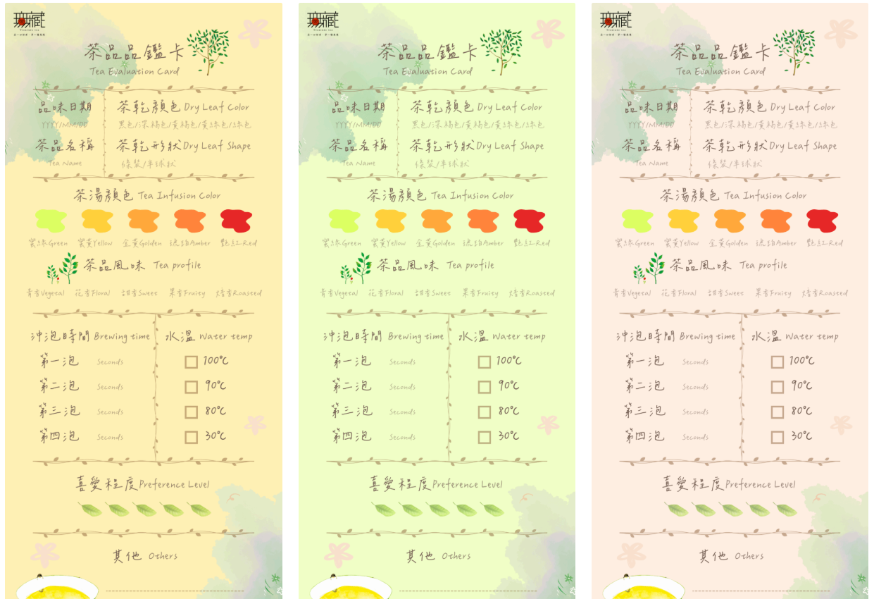 ※※ 茶品品鑑筆記卡讓使用者能在品茶過程中,系統化地記錄下每一次所品嘗的茶款、茶乾顏色、茶湯顏色,茶品風味等細節。這張卡片的設計目的,是讓品茶不再只是口感的感受,而能被清楚地記錄與回顧。