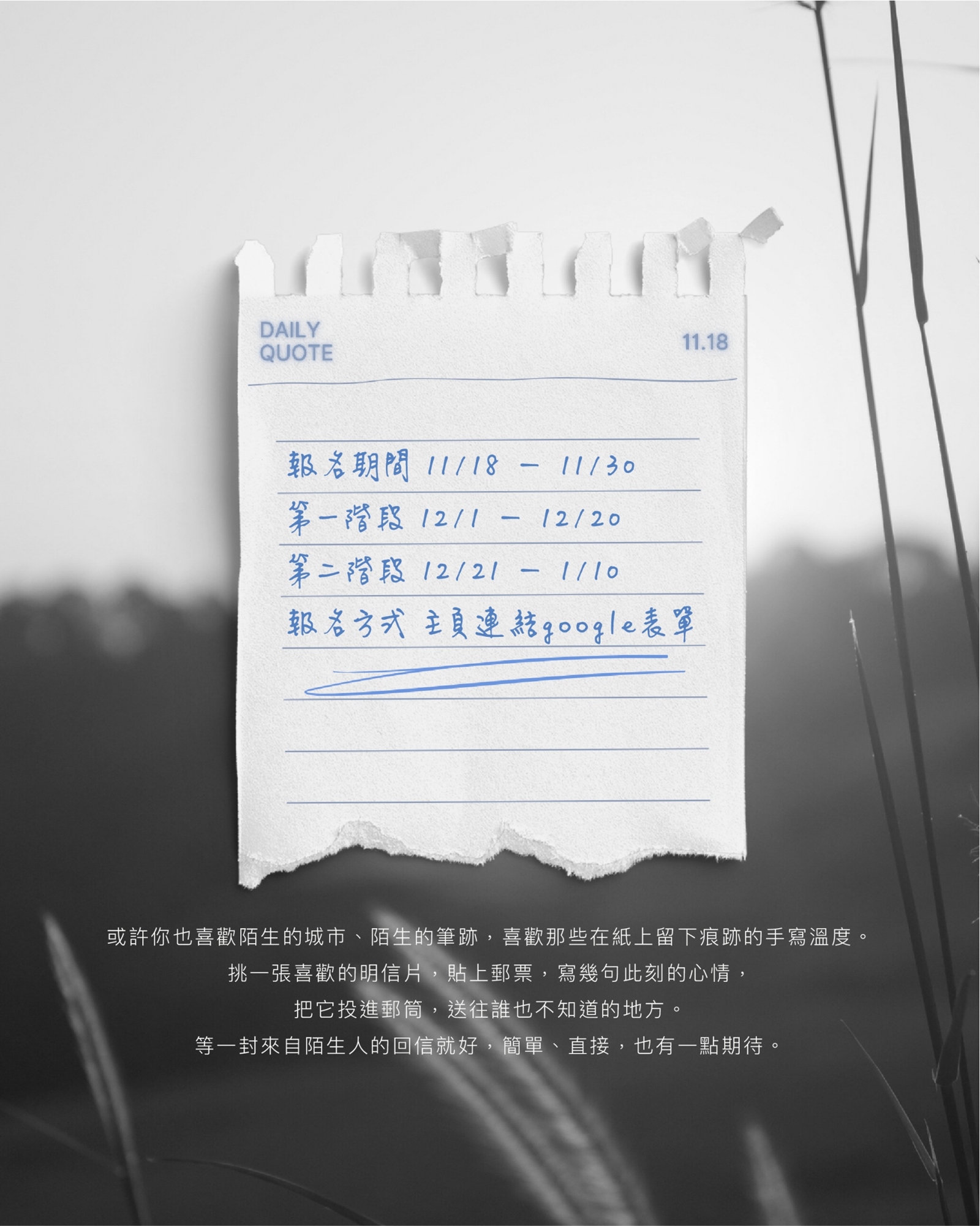 報名完成後請留意信箱,每位參與者會隨機分配到一個屬於你的匿名稱呼(例:熊貓、麋鹿、貓咪),及一個筆友的地址(筆友也是匿名稱呼),隨即開始兩週的時間讓各位寫明信片給筆友,同時你也會收到另一位筆友寄給你的明信片喔!