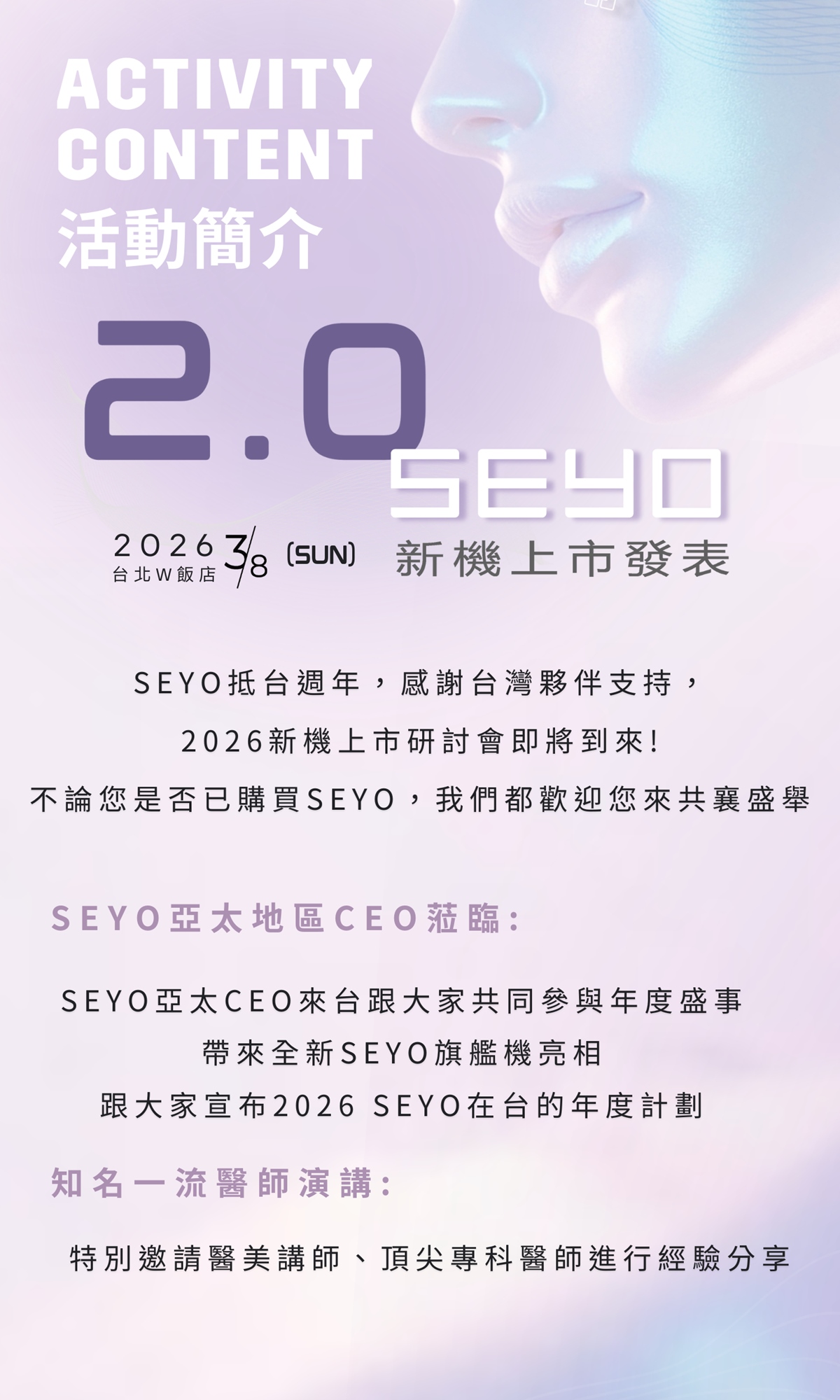 2026 年,SEYO 迎來品牌上市 2 週年,同步推出 旗艦設備 2.0 與 兩款全新安瓶 2.0,全面展開 SEYO 的下一個發展階段。