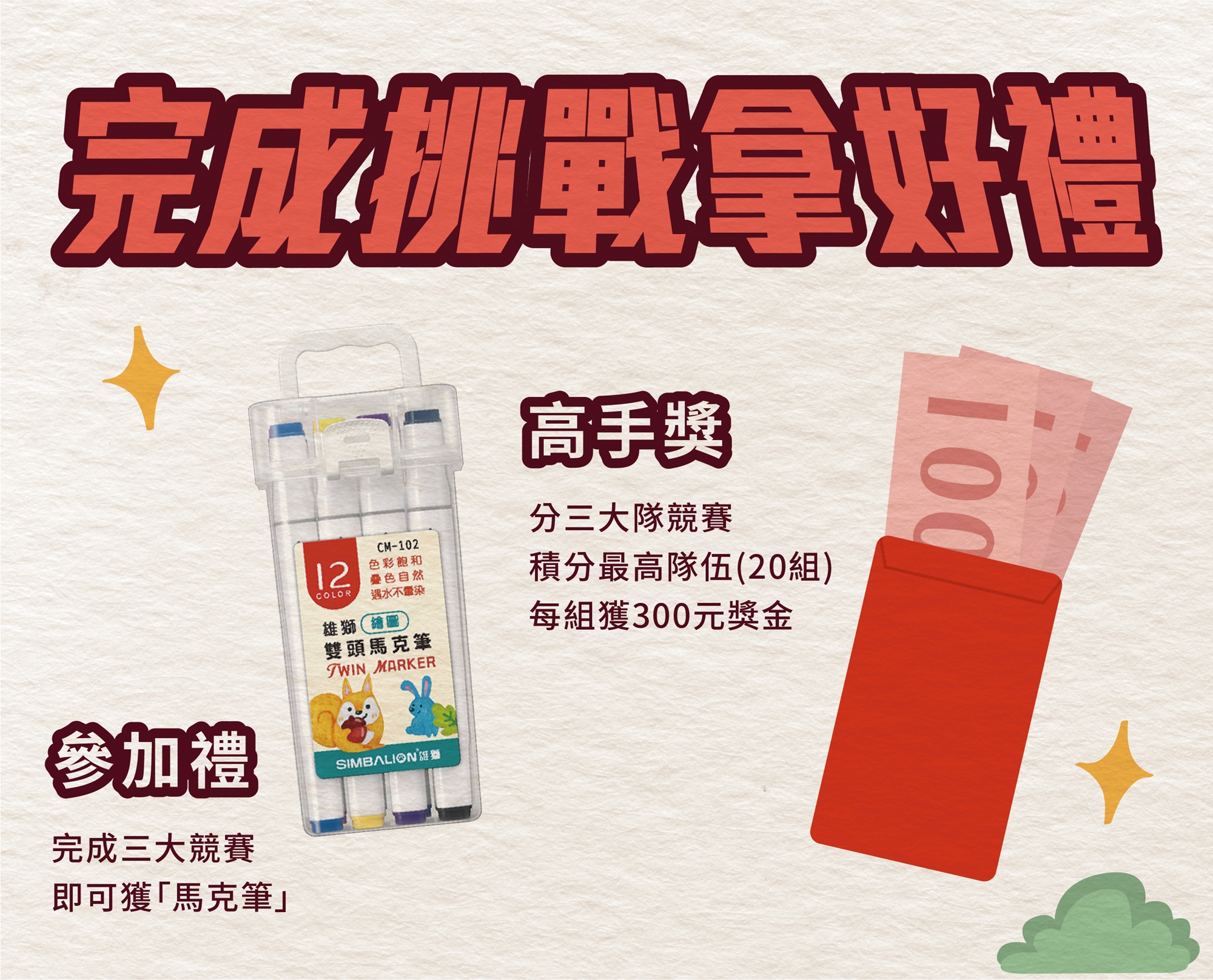 - 活動獎勵:完成賽事即可獲得「彩繪馬克筆」乙份