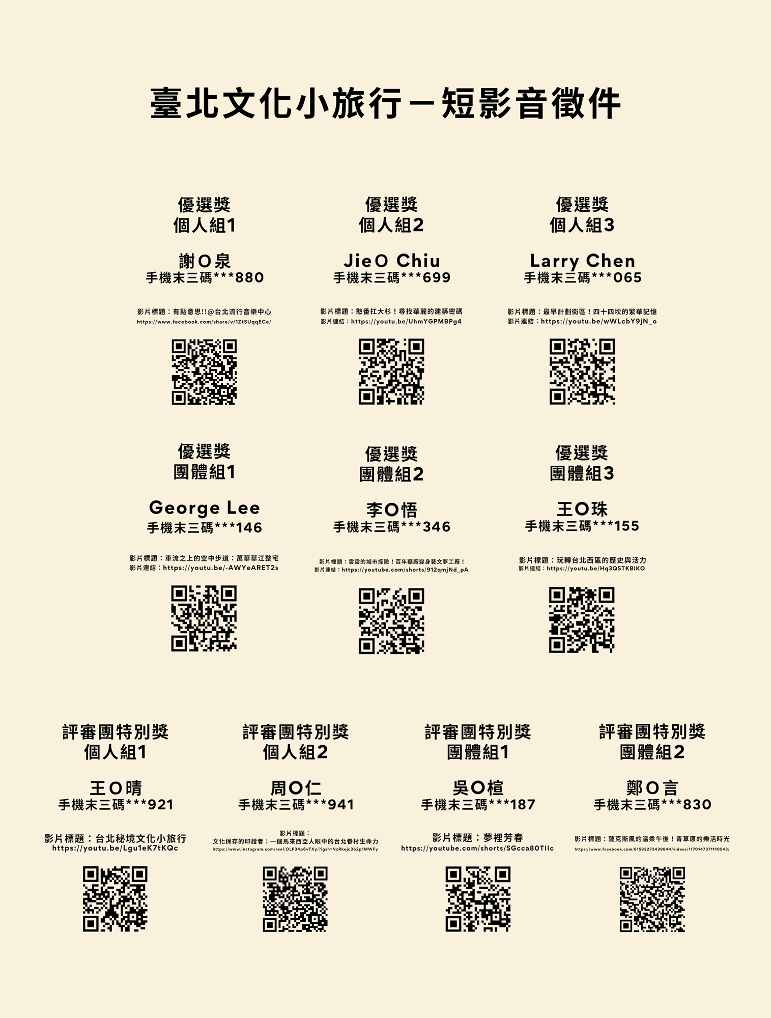 恭喜本次「臺北文化小旅行-短影音」活動得獎者!