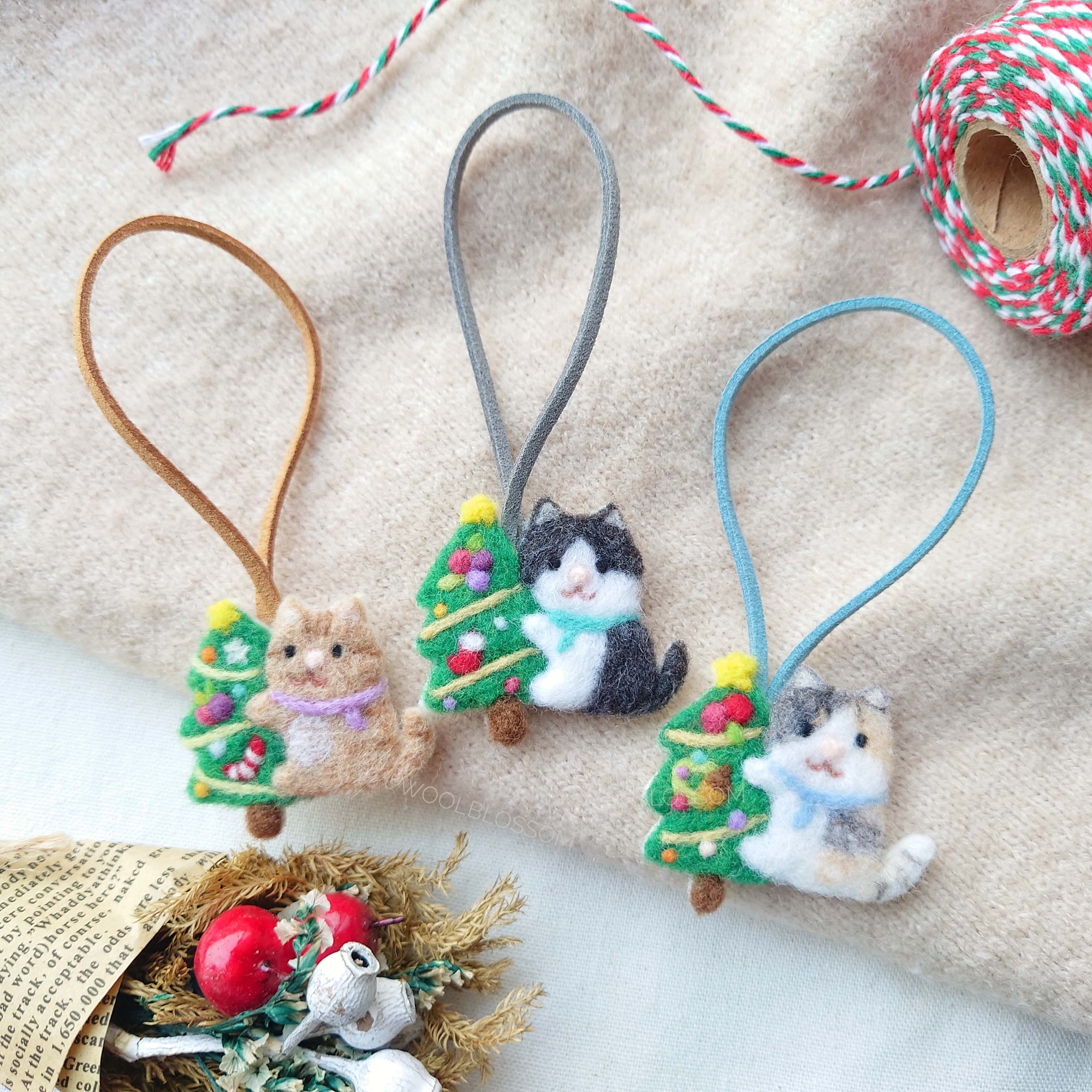 可愛小動物無論是抱著聖誕樹,或是站在聖誕花圈上,都充滿聖誕節慶的氣氛。經典款小兔子之外,這次也加入了小豬及貓咪,可以挑選想製作的款式。圖案是戳刺在不織布上,是扁平又帶些微立體的感覺唷!