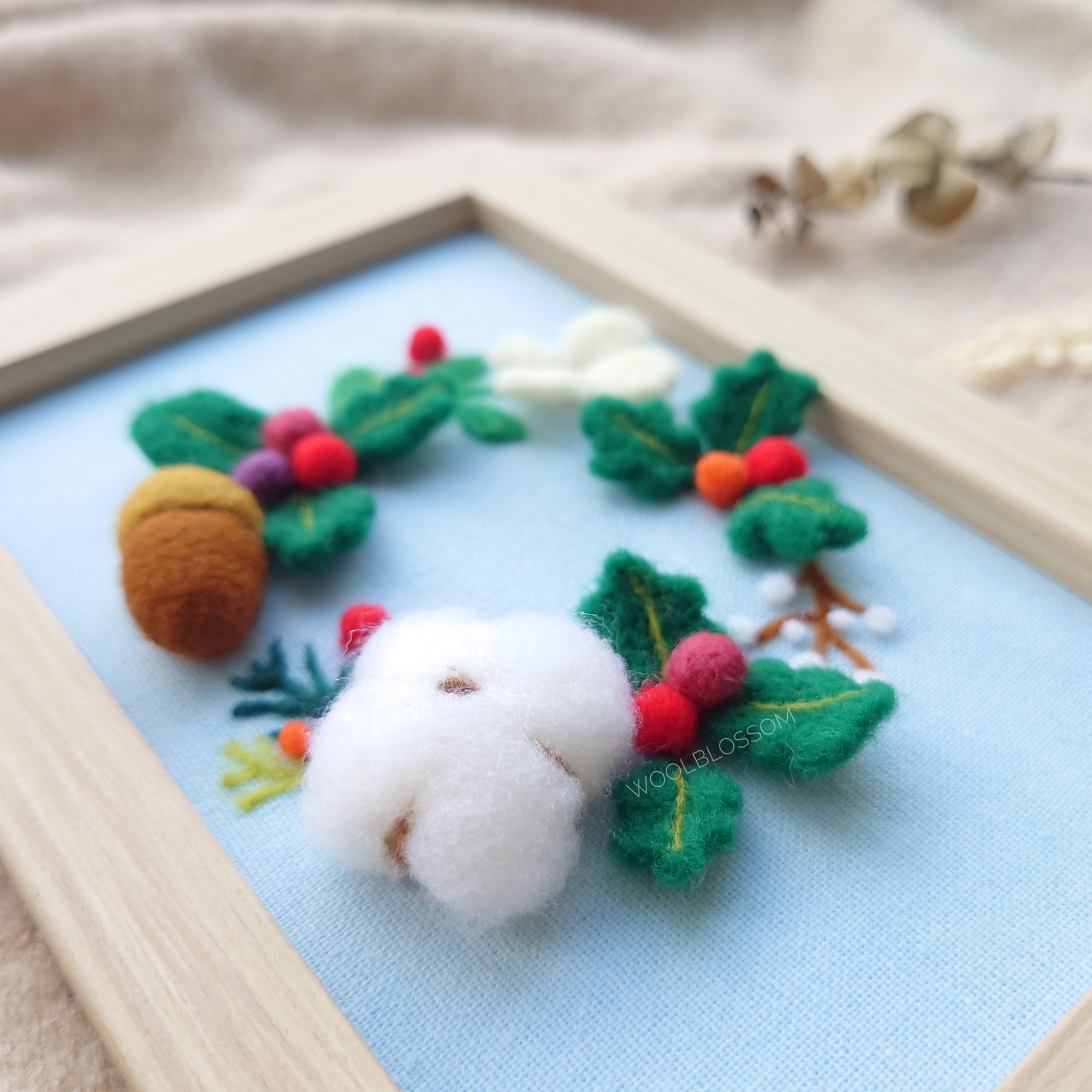 結合多種羊毛氈技法,如立體橡實、扁平的冬青葉、蓬鬆的棉花、平面的松柏類針狀葉片等。植物位置沒有一定順序,可自由設計專屬的花圈,會額外提供乾燥的花材姬蕨,可以一同加入花圈增添層次喔!